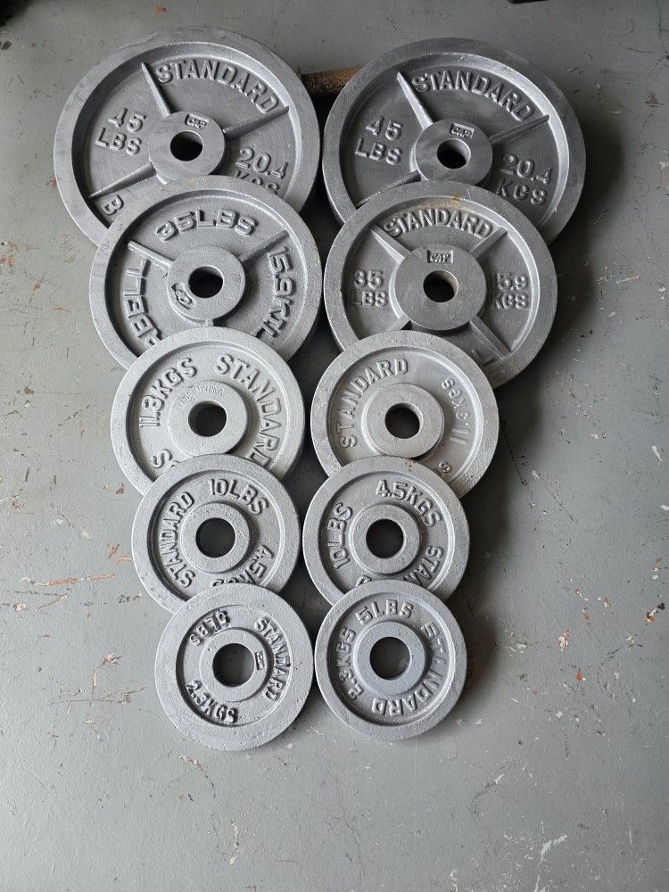 Standard gym plates. 2 45s 2 35s 2 25s 2 10s 2 5s
