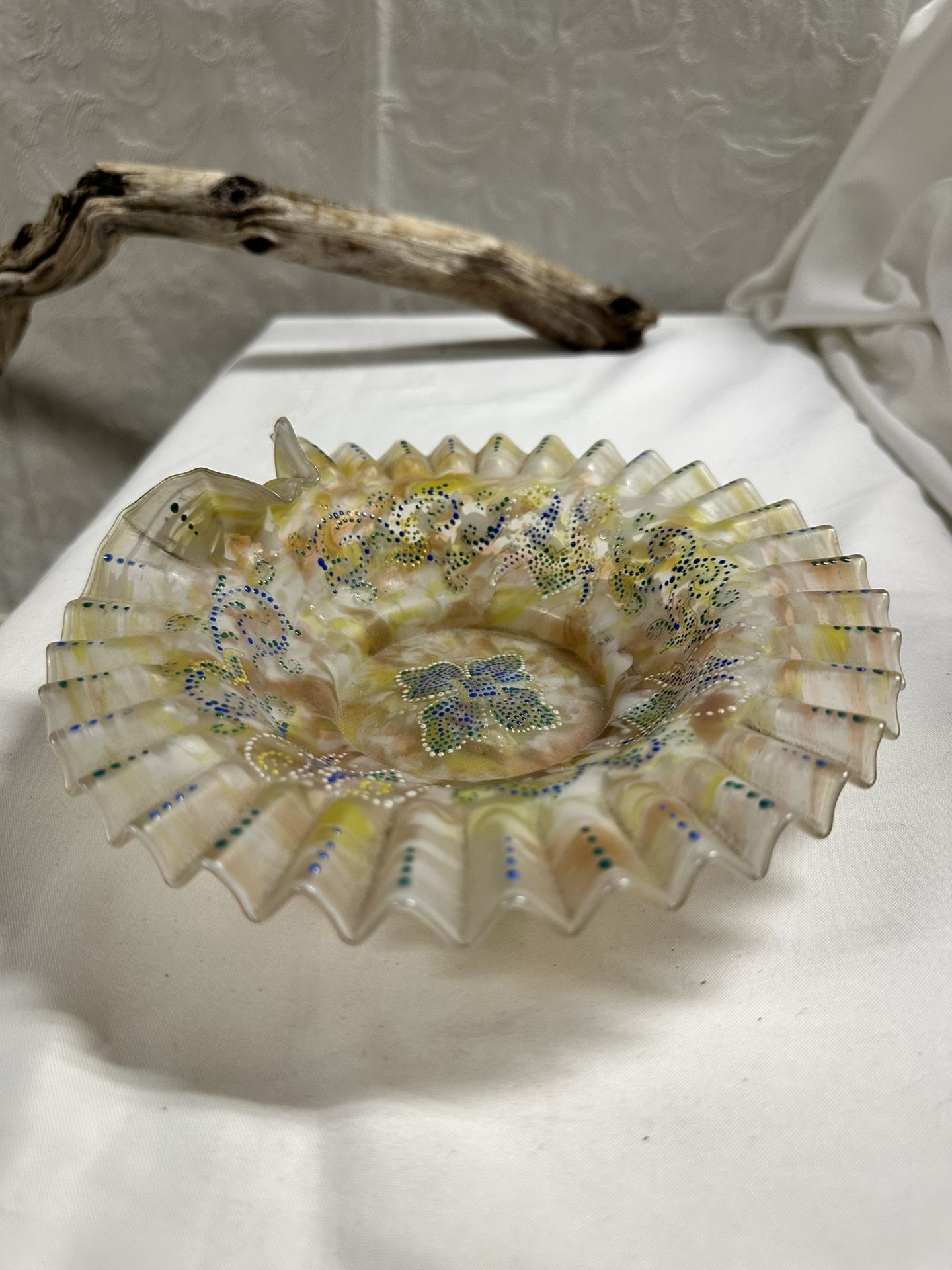 This is a vintage shallow opalescent glass bowl with a ruffled edge and a hand-painted enamel decoration. It has a beige and yellow swirl and blend of translucent glass with a ruffled rim. The bowl has a central, raised design and is decorated with small, colorful enamel dots forming a nature pattern. It is in excellent condition. Uncertain of maker, perhaps Fenton, Northwood or even Murano.