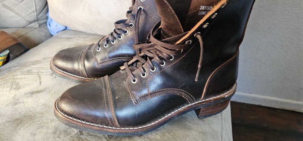 These are the Thursday Boot Company Men's Logger lace-up boots in the Waxed Cacao leather color. They are a popular lifestyle boot known for their quality construction and rugged style. Slightly used that give the leather a beautiful look. Real American Boots