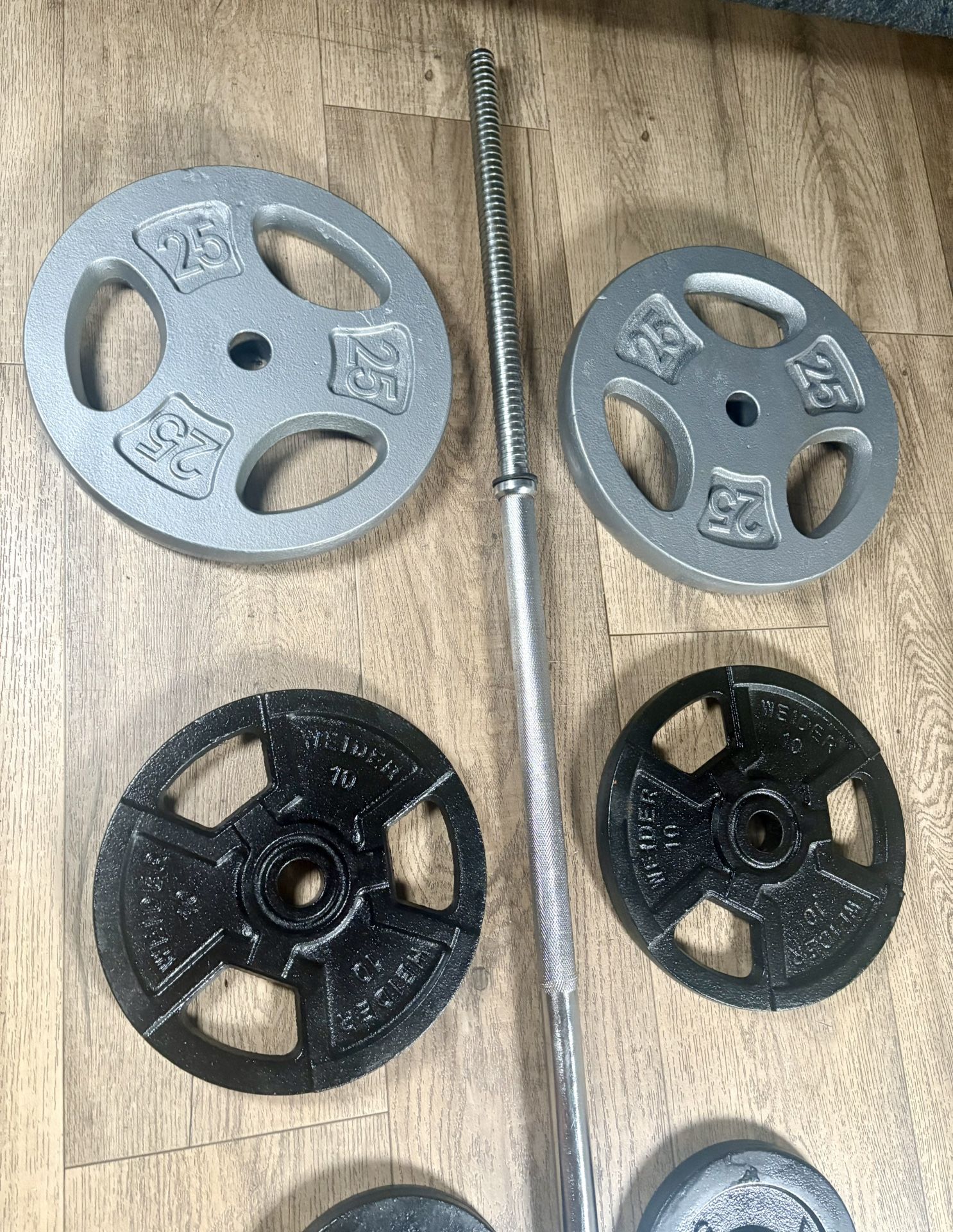 The Bar is being gently used and perfectly clean. The weight plates are mainly CAP (a pair of Weider) all reconditioned. Great bar to start this year healthy goals. (2) plates 25 lbs (2) plates 10 lbs (2) plates 5 lbs (1) Barbell 20 lbs (2) locks Total: 100 lbs