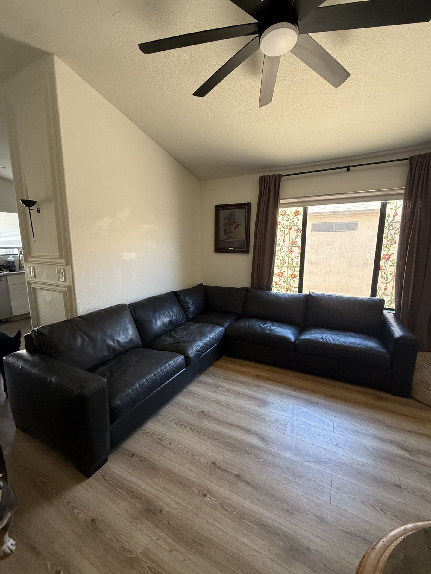 Good condition but as you can see it doesn’t fit the wall I’m wanting to move it to so I need to replace it. Real solid black leather Left side length- 112” Right side length- 112” Height- 28” Depth- 36”