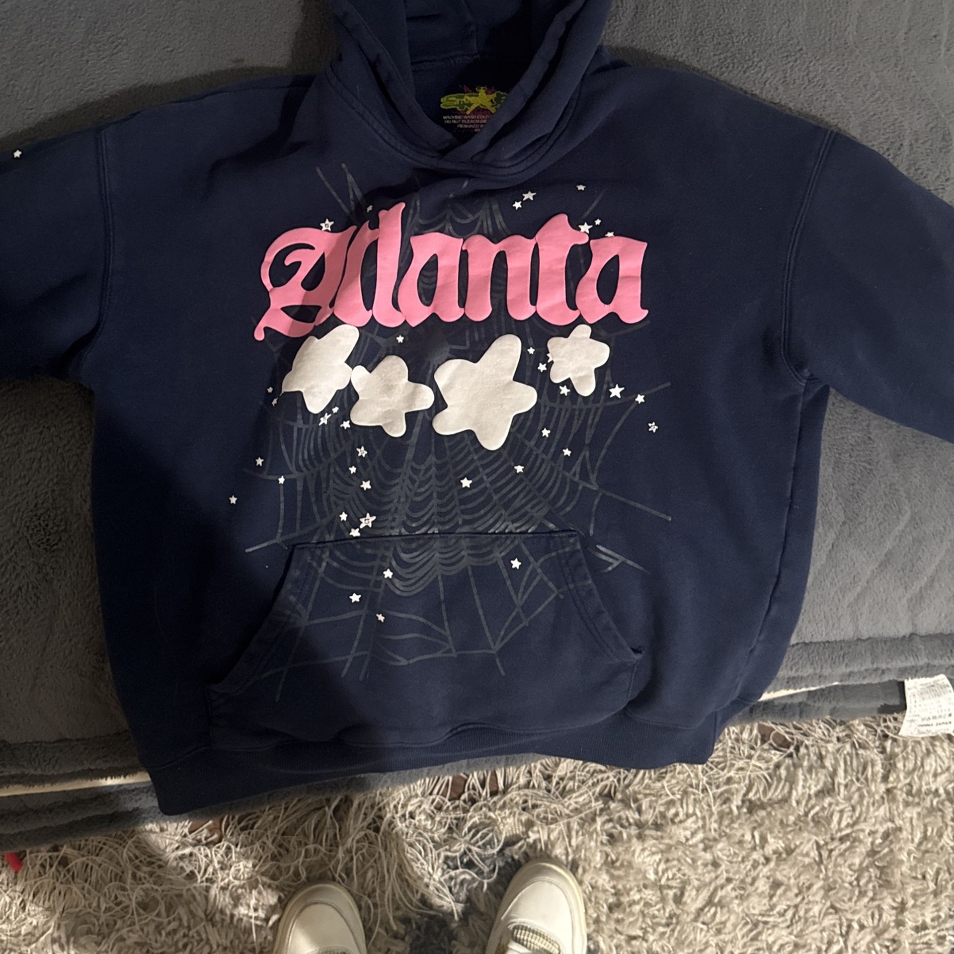 dark blue atlanta spider hoodie, puff print cracked a little cause of dryer, size large, fits like a medium due to shrinking