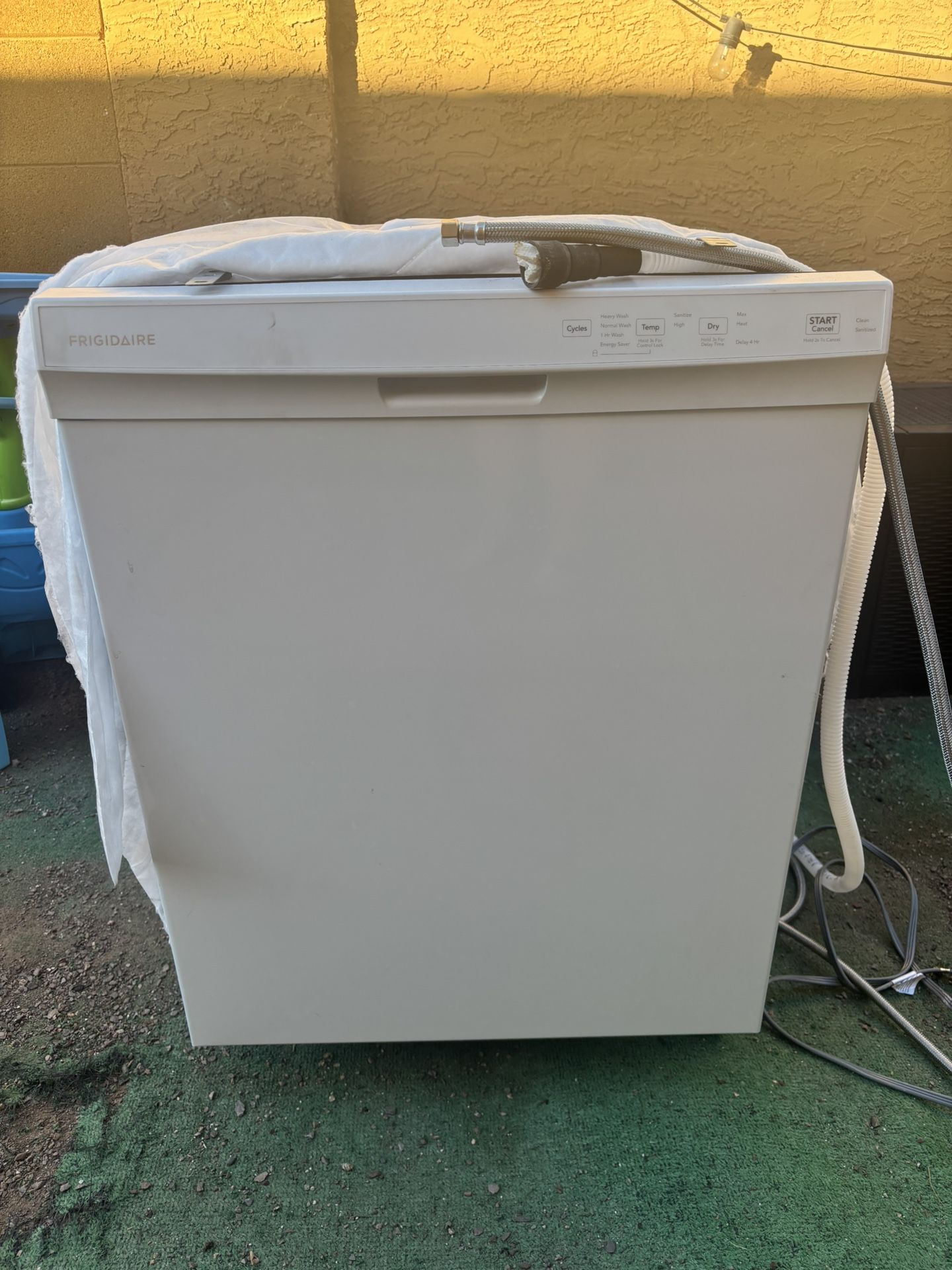 75th ave and Olive. Like New Frigidaire white dishwasher. Purchased last year but replaced this year with kitchen appliance set. Lightly used in home with no pets. See pictures for measurements.