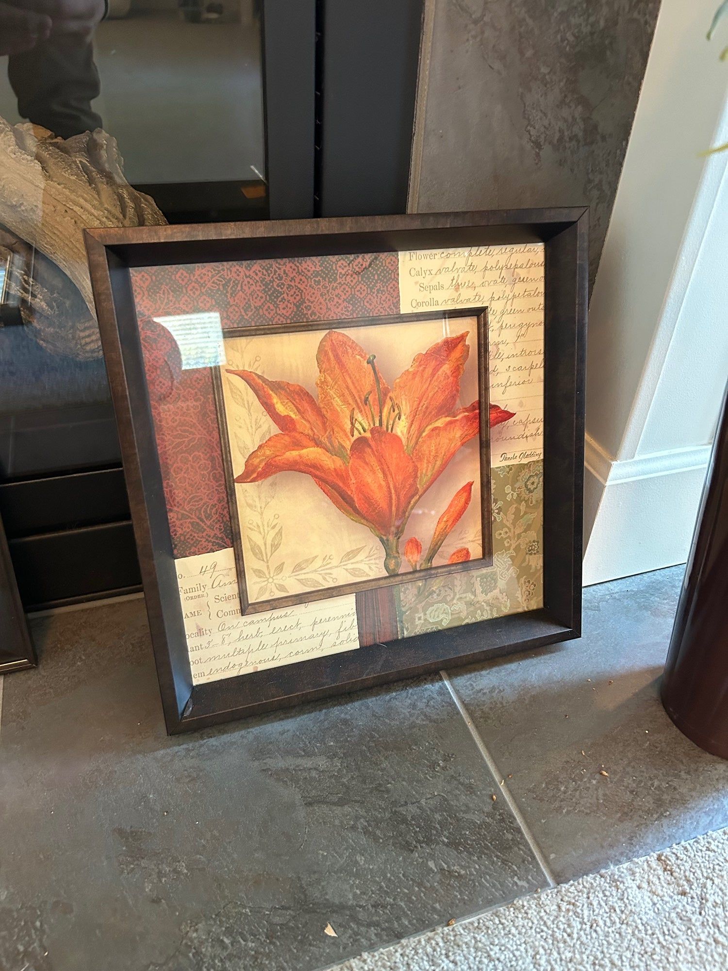 Soft lily floral print framed for display—peaceful and pretty addition to your walls. Dimension: 13.5” L x 13.5” W