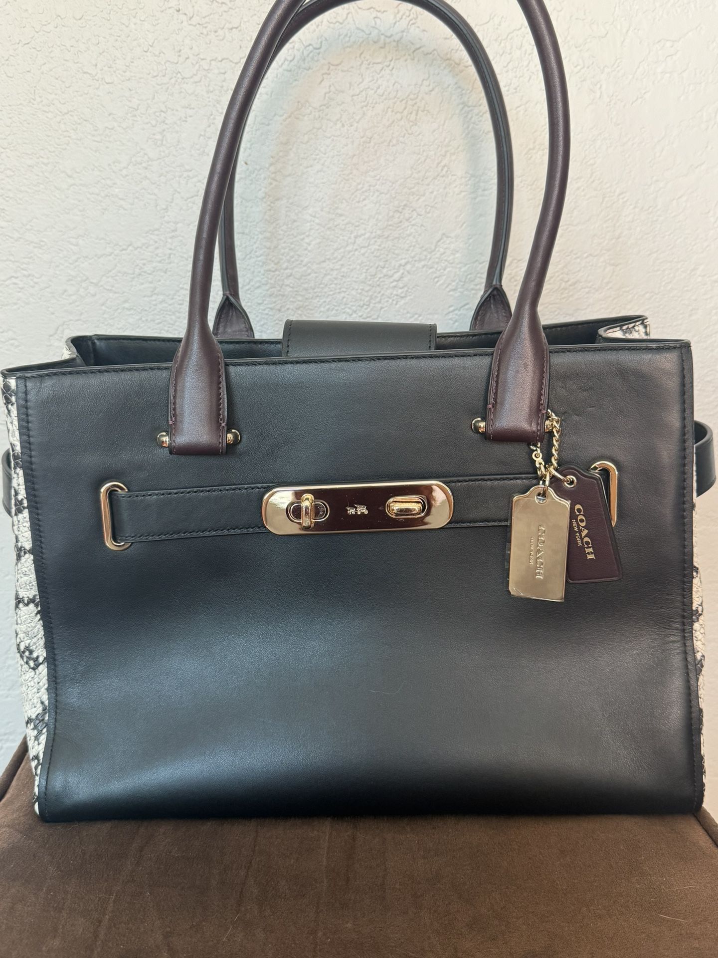 COACH SWAGGER CARRYALL IN COLORBLOCK EXOTIC EMBOSSED LEATHER (COACH F36498) LIGHT GOLD/BLACK COACH STYLE # F36498 Details Leather Inside zip, cell phone and multifunction pockets Magnetic closure, fabric lining Handles with 8" drop 13" (L) x 9 1/2" (H) x 6 1/4" (W)