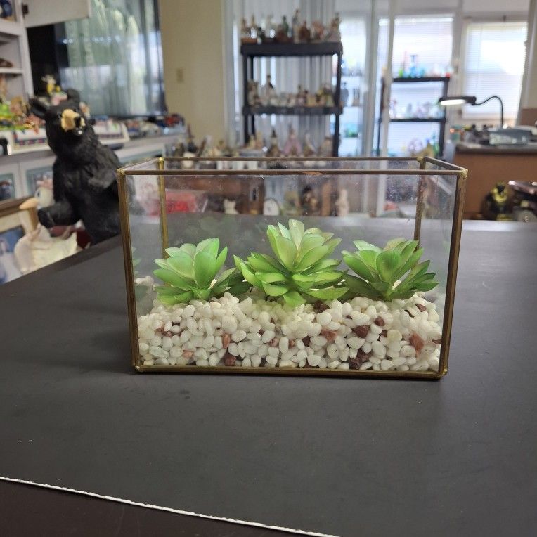 Three Faux Succulents In Rectangular Glass Planter With Brass Frame Filled With White & Earth Tone River Rocks Or Pebbles 7" X 3.5" X 4.5"H