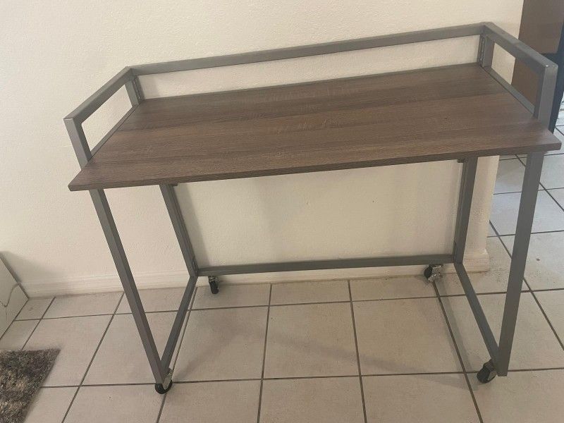 Great condition metal frame desk with wooden top. Comes with wheels for easy movement.
