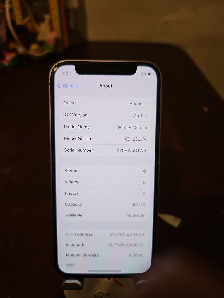 Iphone 12 mini purple 64gb model Blacklisted by At&t Wifi only No icloud ios 17.5.1 Back is Cracked