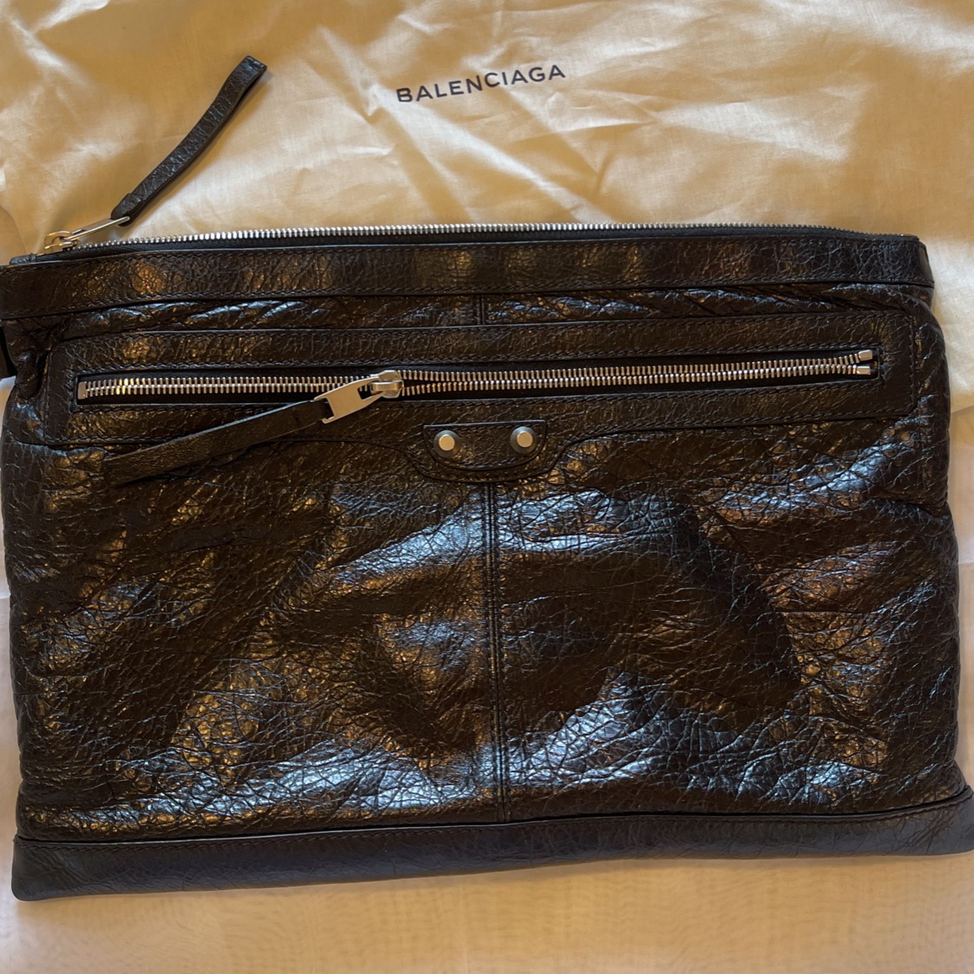 Balenciaga leather motocross M-Chip Clutch Bag Spring / Summer Collection 2016 Silver-tone hardware. 1 exterior pocket w zipper. 2 compartment inside lined with black canvas. Comes with dust bag. 15”x10”x .5”