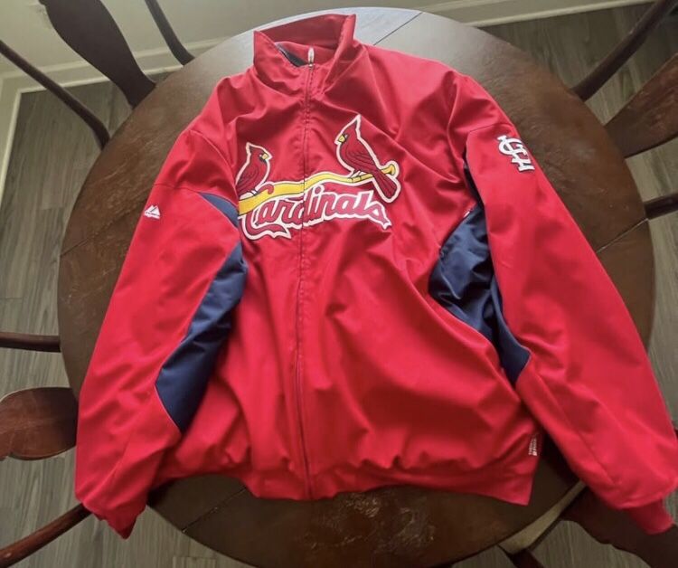 Great red Cardinals windbreaker with fleece lining. Has a zip-up front and blue accents on the sides. The Cardinals logo is on the front, and there are logos on the sleeves. The inside is lined with gray fleece.