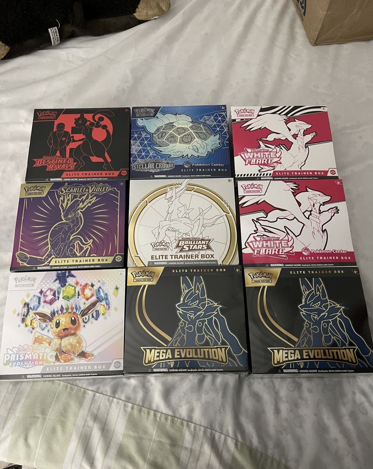 Pokemon center ones are gone and brilliant White flare x2 75$ Destined rivvalsx2 130$ mint condition boxes Violetx1 90$ Prismaticx1 110$ Mega lucariox2 75$ Phantasmalx1 65$ Mega gardevourx1 75$