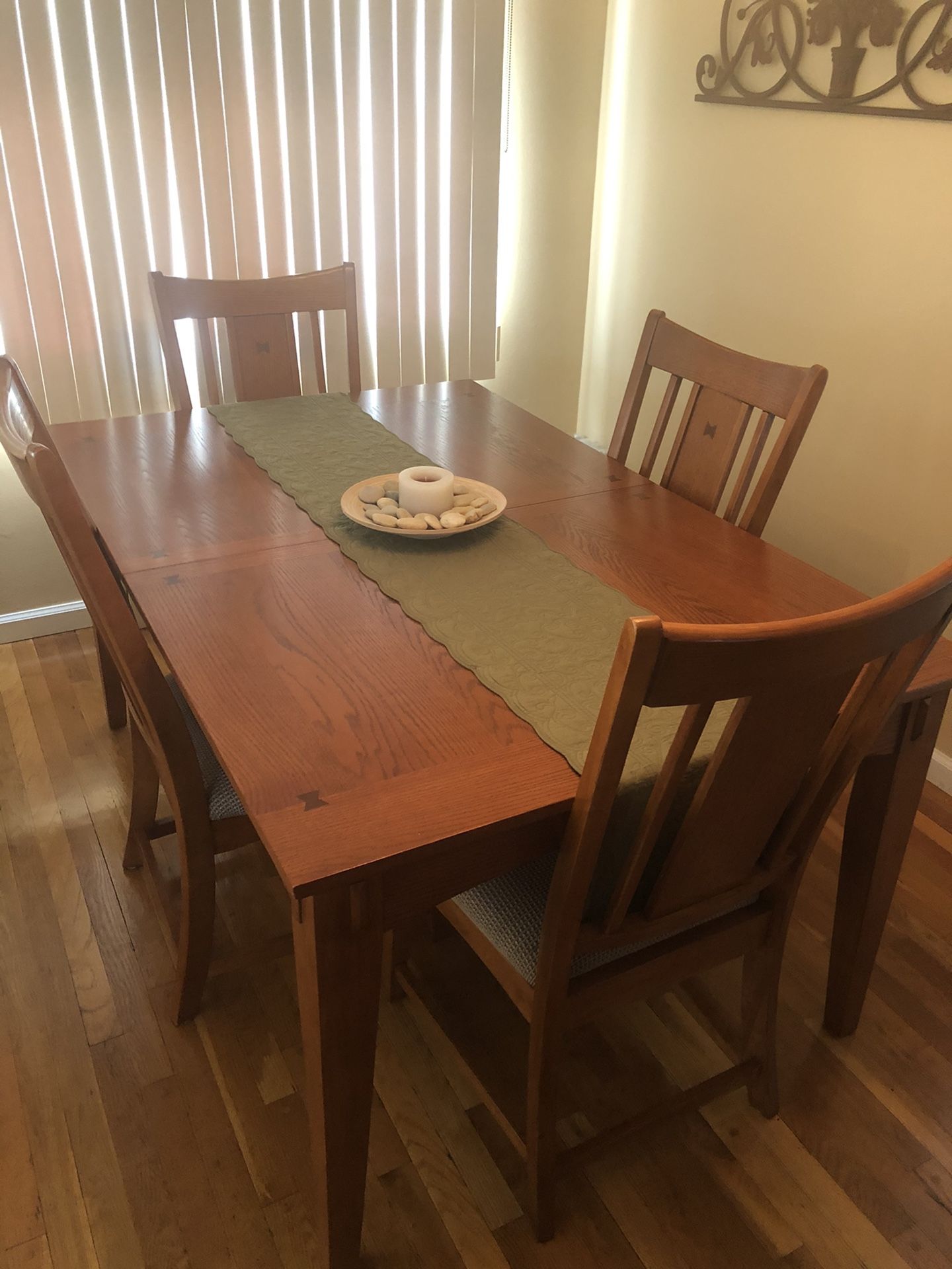 Dining room table with 4 cushioned chairs 62”x 42” closed 80”x42” with leaf....I will include table padding for both lengths with 5 tablecloth’s