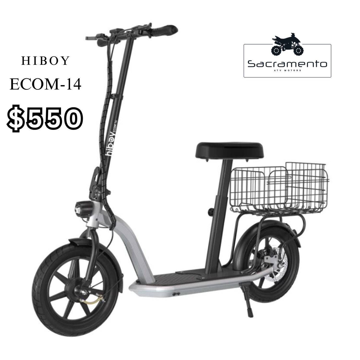 The Hiboy ECOM 14 Fat Tire Electric Scooter is the perfect blend of power, comfort, and eco-friendliness, all for just $550! Featuring a 450W motor that reaches speeds up to 22 MPH, this scooter makes commuting a breeze. With 14-inch fat tires, it tackles bumps and hills effortlessly, offering up to 30 miles of range per charge. The adjustable seat ensures comfort, while dual brakes and bright LED lights keep you safe on every ride. Plus, it folds up for easy storage and portability, making it ideal for city living. Visit Sacramento ATV Motors today to test ride and take home your ECOM 14, fully assembled and ready to roll!