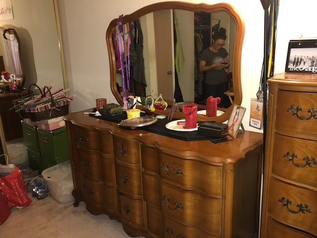 his set of from the 1950’s and is called “The Versailles Collection Patrician”, in cherry finish. The drawers are dovetailed. It’s a beautiful piece and has been one owner. Two night stands, triple dresser chest, 5 drawer and bed frame. These pieces are in excellent shape. Thank you! You