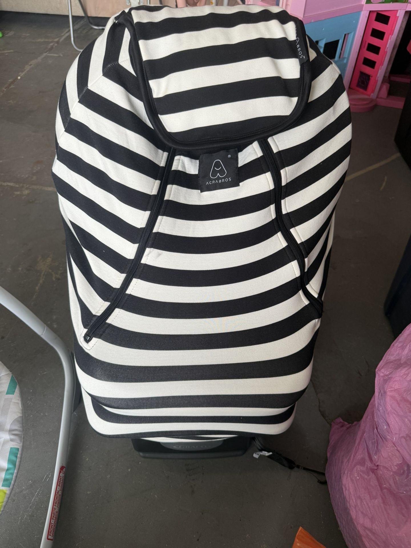 Black & white striped Acrabros multi-use cover in great condition. Can be used as: • Car seat canopy • Nursing cover • Shopping cart cover • High chair cover Soft, stretchy, and clean. No holes or stains. Pickup in La Quinta / 92253. Price: $10