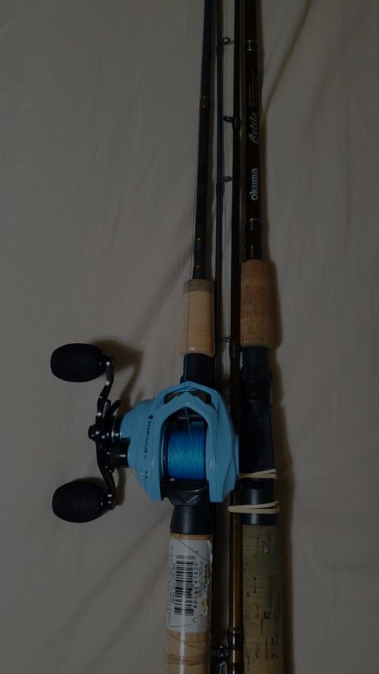 I have 2 different Okuma rods here 1. Okuma Sst casting Specs: 7'6 Power: L Action: M 4-12lbs 1/4-1oz I've used the sst not more than 5 times ______________________________________________________ 2. Okuma Celilo casting Specs: 8'6 Power: MH Action: F 10-20lbs 3/8-3/4oz NO baitcaster This one is a little more used the cork handle has a little color from my blue braid but overall this rod is still ready to catch fish Photos have retail prices of the exact items Asking 80 for the SST Asking 50 for the Celilo Or together 120