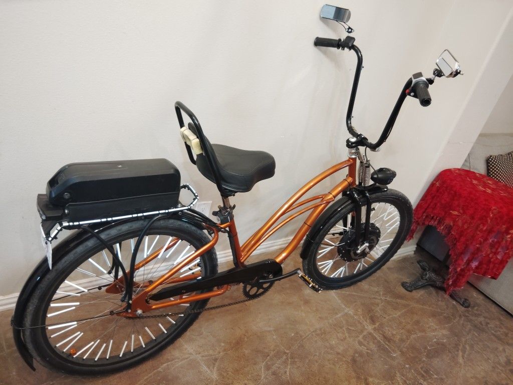 Custom 26" Electra Cruiser Electric Battery powered Charger included Speed: 21 mph Color: Rusty Orange Front Wheel Hub Motor Front Fork Suspension Black fenders