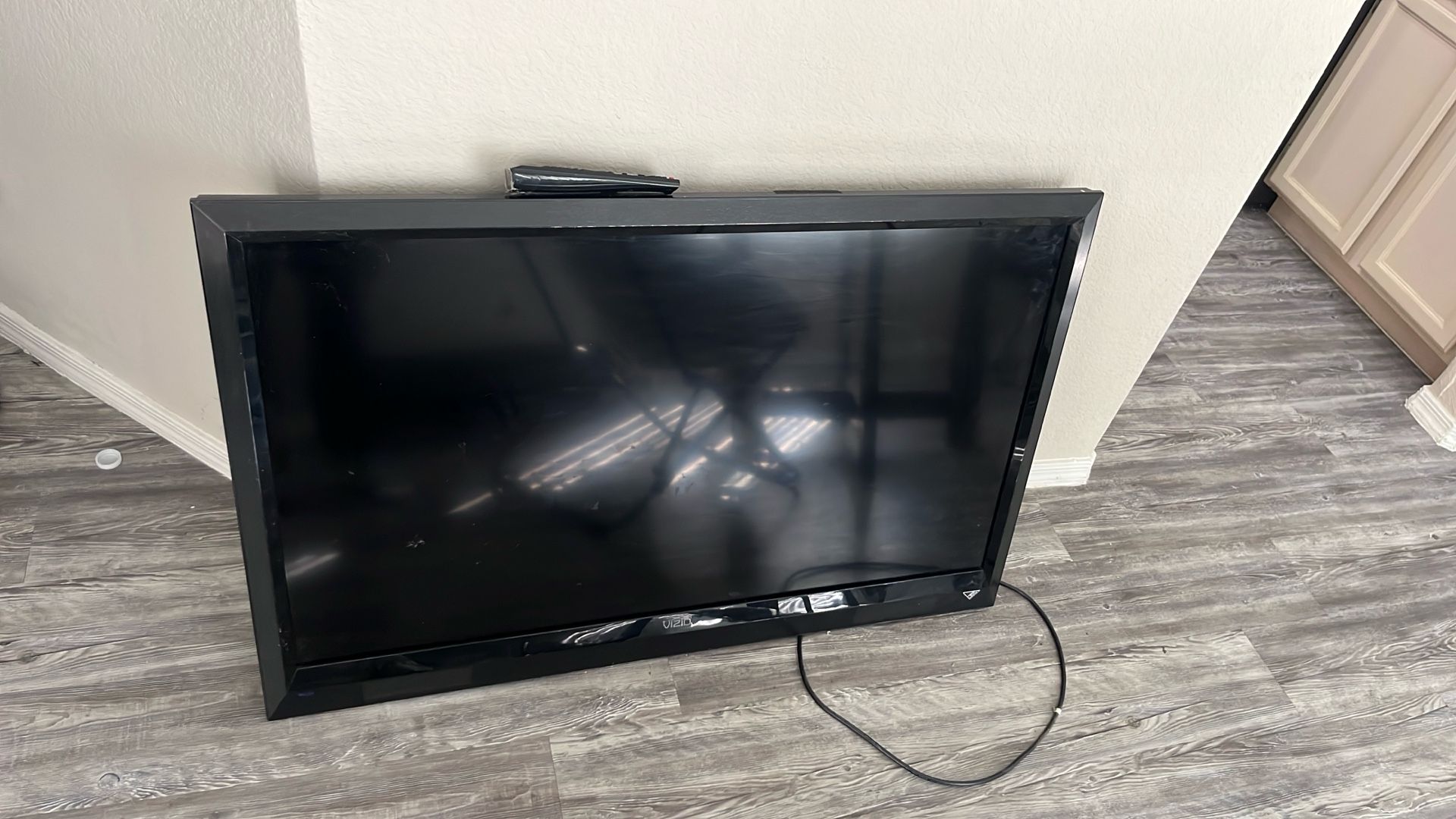 44 inches. Comes with remote and Velcro strips on top of tv and back of remote. (Does not have a ground mount can only be mounted on walls, wall mount is not included.)