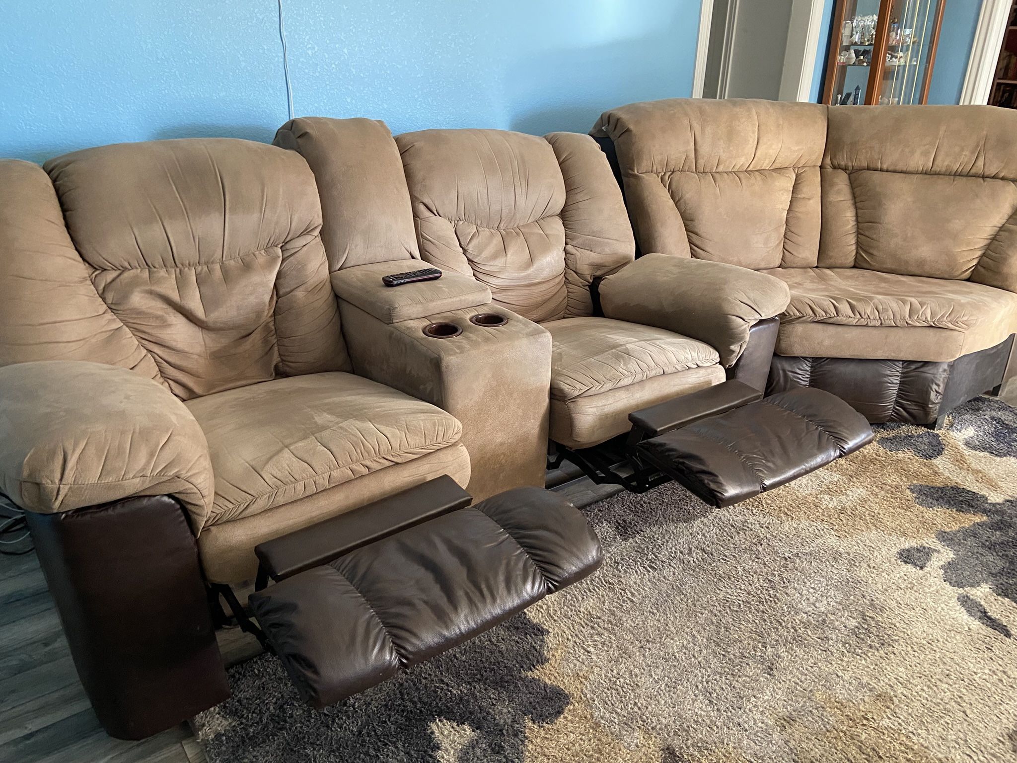 Light brown sectional that seats up to 7 people. Has 4 Manuel leg rests