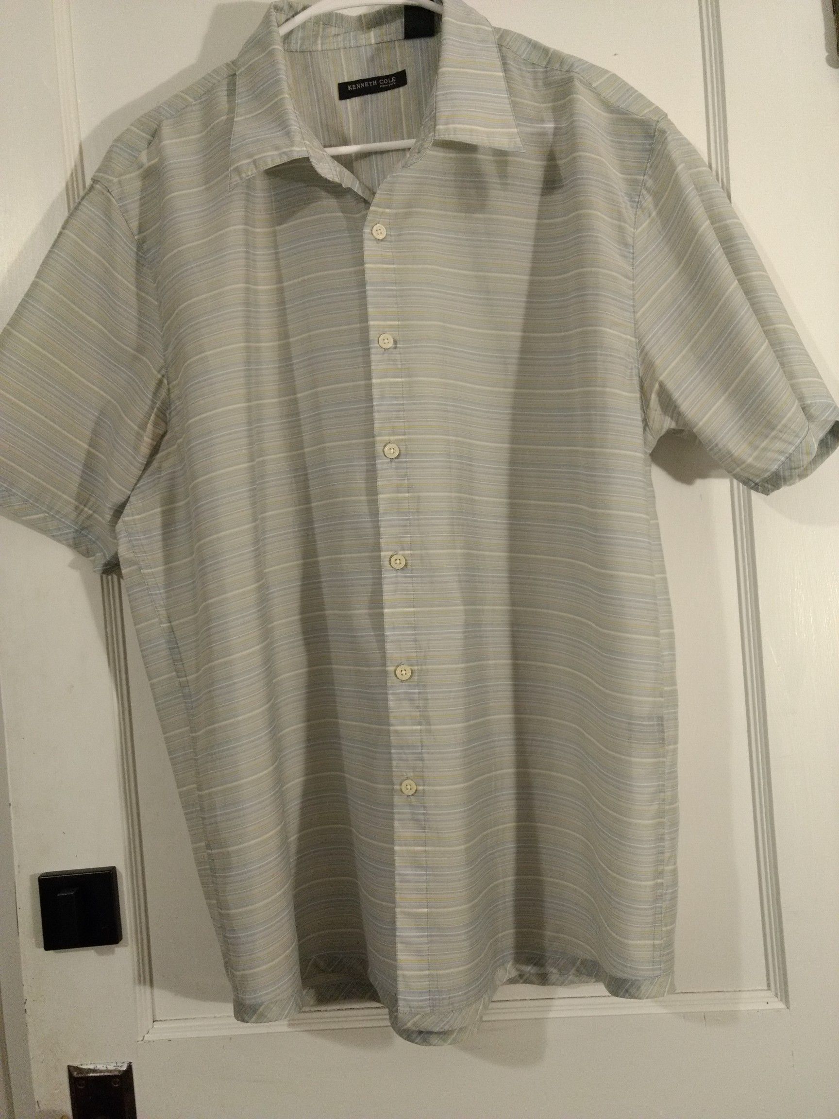 Beautiful Kenneth Cole dress shirt Semi-sheer material Multicolor thin ribbon print Shades of Blue, Olive, white Size: XXL slim fit 73% rayon / 27% nylon