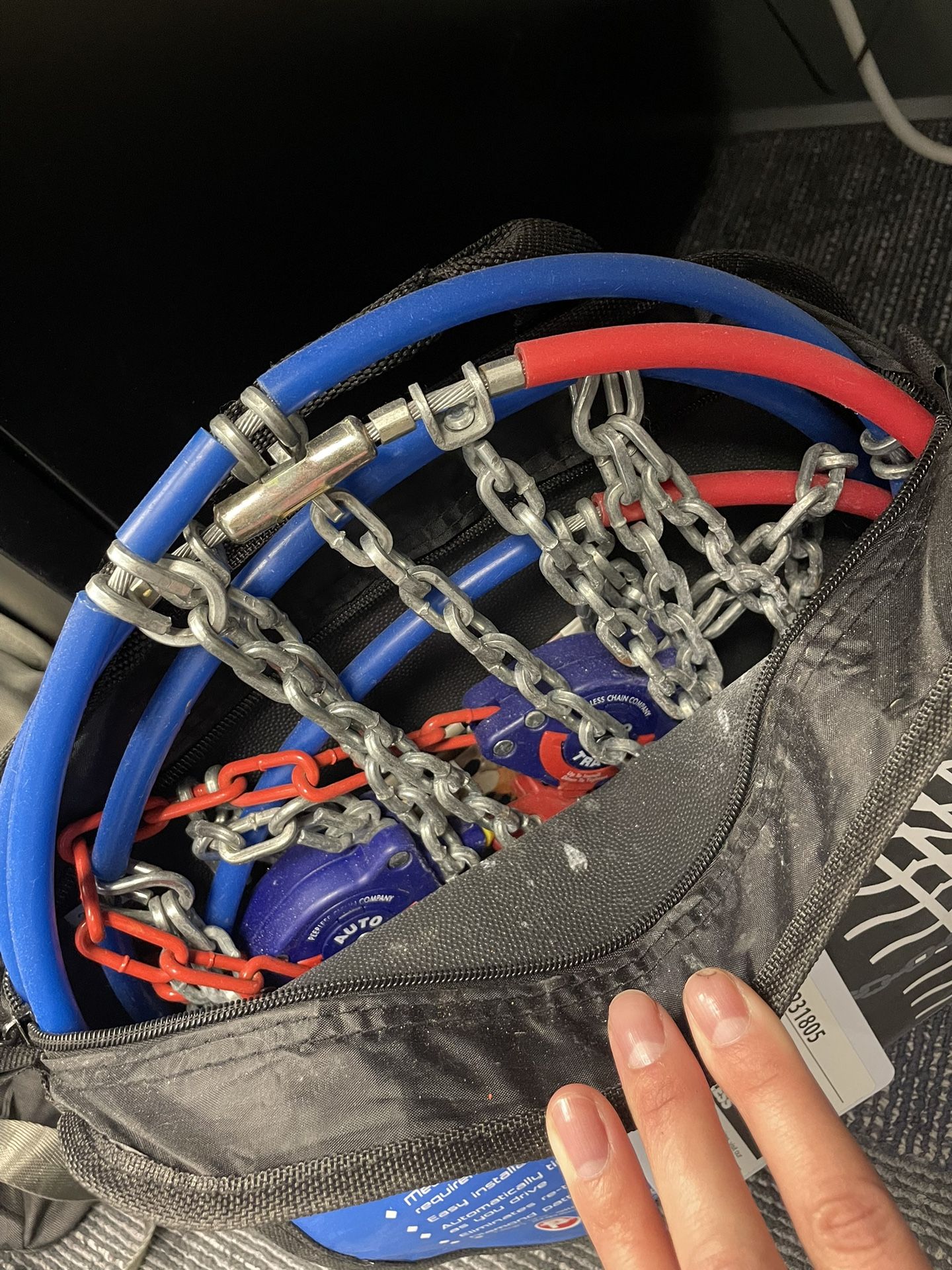 Self-tightening traction chains. These things were amazing! Only selling them because I have a new car and they don’t fit. Used them on snow/ice in Leavenworth for a weekend and had no issues. Ridiculously simple to put on as well. Practically new.