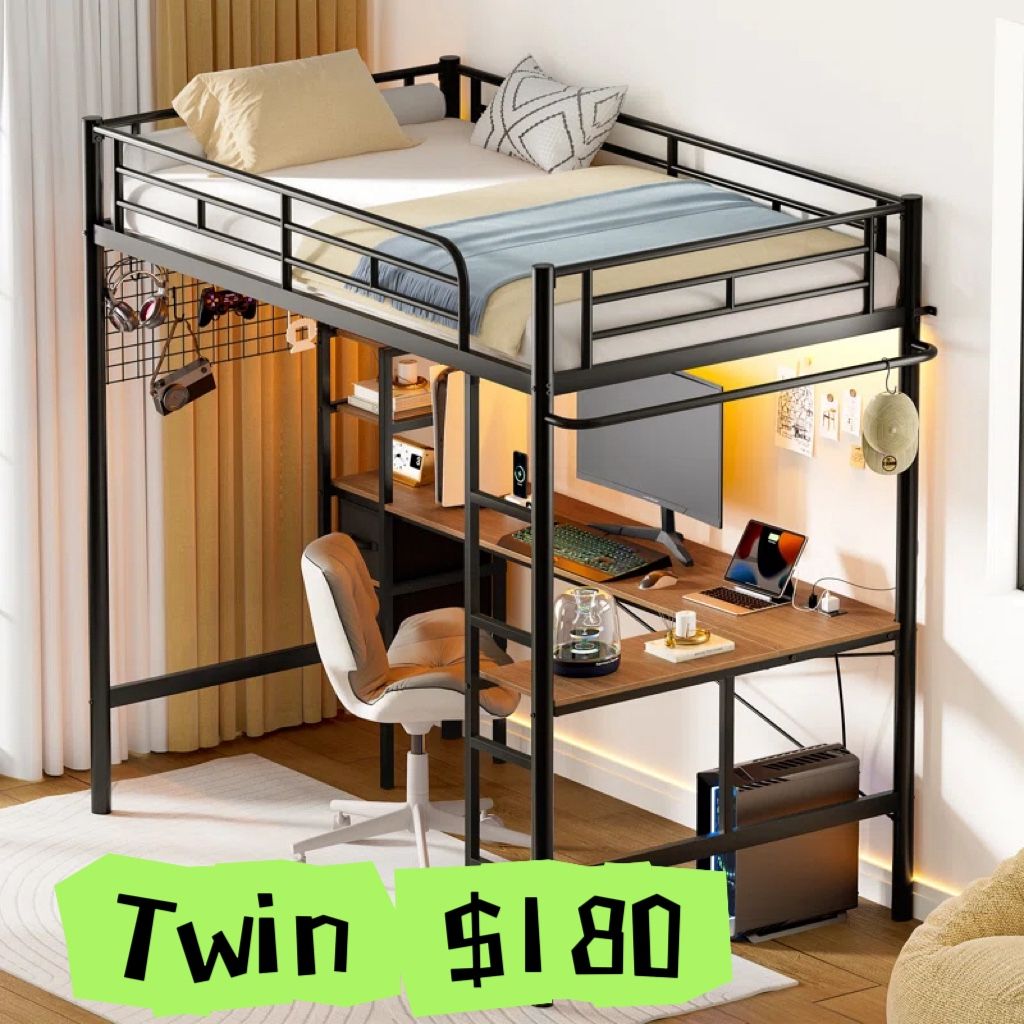 package Dimensions 79"L x 16"W x 8"H Item Weight 104.5 Pounds Save more space with the stylish Twin Loft Bed, designed with both style and functionality in mind. It comes with a convenient L-shaped desk for your study or work needs, as well as 2 spacious fabric drawers with multi-level storage shelves for your various storage needs. The desk's built-in charging station ensures your devices are always charged, while the LED lights add a touch of ambiance and convenience. Sturdy guardrails and easy-to-climb stairs prioritize safety, making it ideal for children and adults alike. No spring box is required, maximizing space without sacrificing comfort. Features Loft Bed With L-shaped Desk: The loft bed can be configured as two separate spaces. It offering a cozy retreat for rest while maximizing the area below for work or relaxation. The built-in L-shaped desk creates a stylish, efficient workspace, perfect for studying and working for making the most of limited space. Adjustable Lighting & Charging Station: The bed frame features 2 AC outlets with 1 USB and 1 Type-C for charging your phone or iPad. You can customize your favorite atmosphere by selecting 20 static colors and 22 dynamic modes via the remote control. Enjoy the convenience and warmth it brings you. Multifunctional Storage Design: The storage space under the bed is extremely spacious, with multiple open shelves and two fabric drawers, perfectly meeting all your daily storage needs. What's more surprising is that the hanging rail on the left side is ingenious, which can skillfully store those small objects and keep your desktop always in order. Every design adds convenience and comfort to your life. Sturdy & Safe: The sturdy metal frame construction with tightly arranged metal slats not only greatly enhances the stability of the bed, but also effectively avoids any swaying and tilting. The raised guardrails around the perimeter provide you with extra security, so you don't have to worry about falling when you roll over or sit up. Equipped with a humanized design, the ladder is stable and easy to get on and off, making it easy and safe to use for both adults and children. Easy assembly & complete service: The bed frame comes with detailed instructions, assembly tools, and numbered parts. The mailbox on the product manual will provide you, making installation and use much easier. Professional Assembly - $75 Delivery charges based on distance