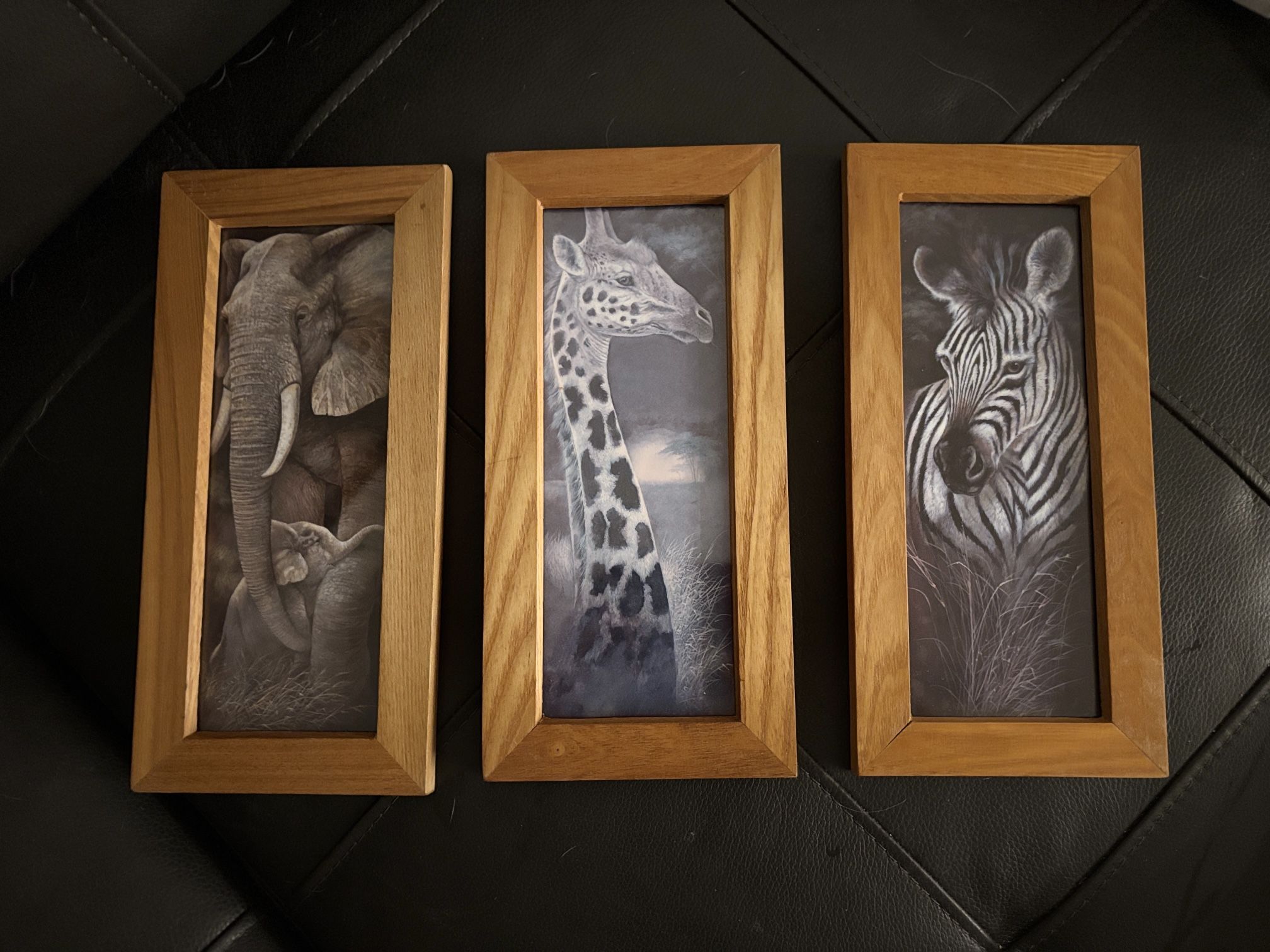 An elephant, giraffe, and zebra each in a wood frame. Perfect for DIY project, Kids Bedroom, etc. excellent condition! 11.5”h x 5.5”w
