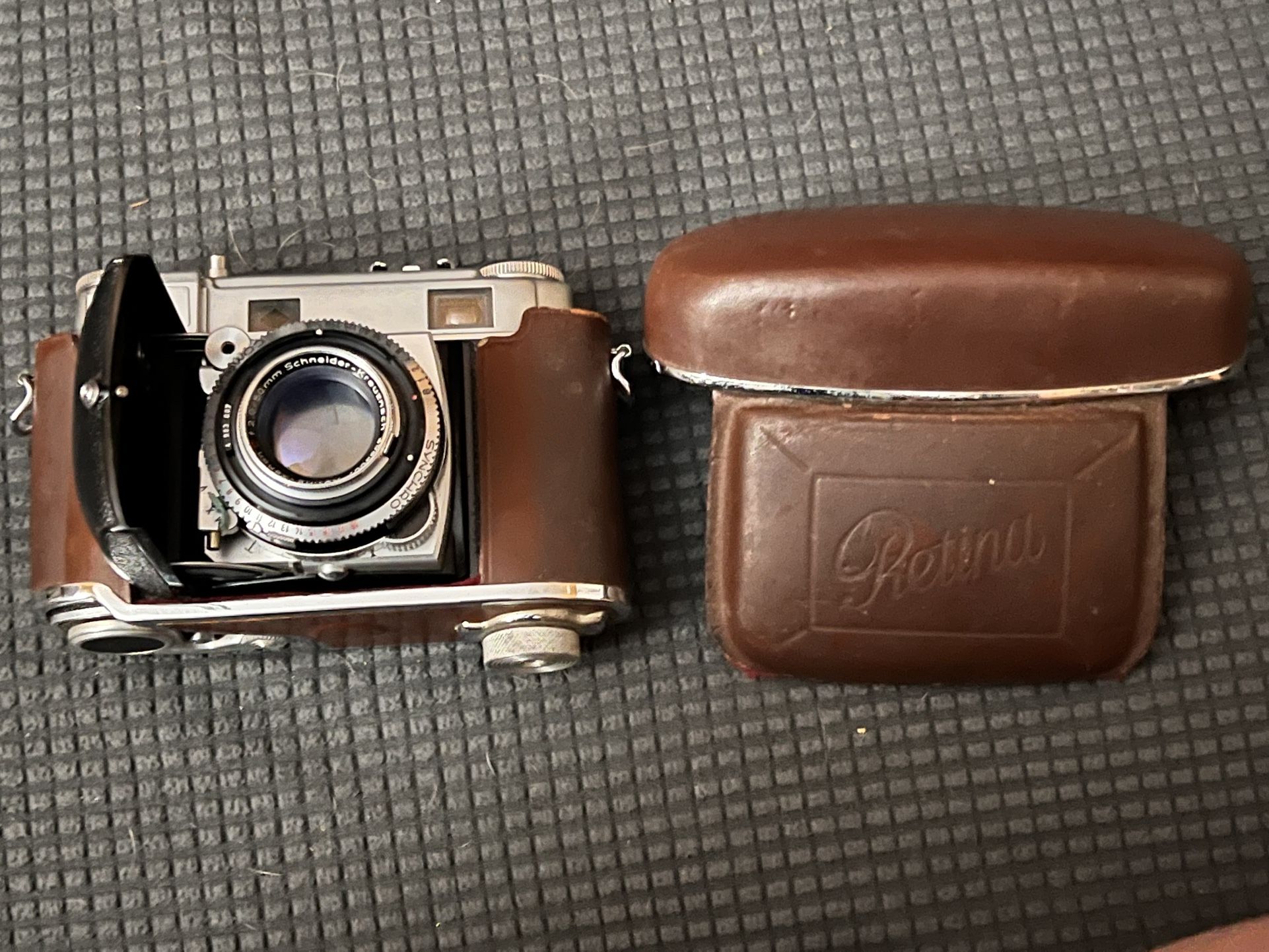 The item pictured is a Kodak Retina IIIc It is a 35mm rangefinder camera produced by Kodak AG in Stuttgart, Germany during the 1950s. It features a compact, folding design where the lens assembly slides forward on a track for rigidity. The camera includes a built-in selenium light meter and a combined rangefinder/viewfinder. It was noted for its high quality and the ability to swap the front optic for wide-angle or telephoto lenses.