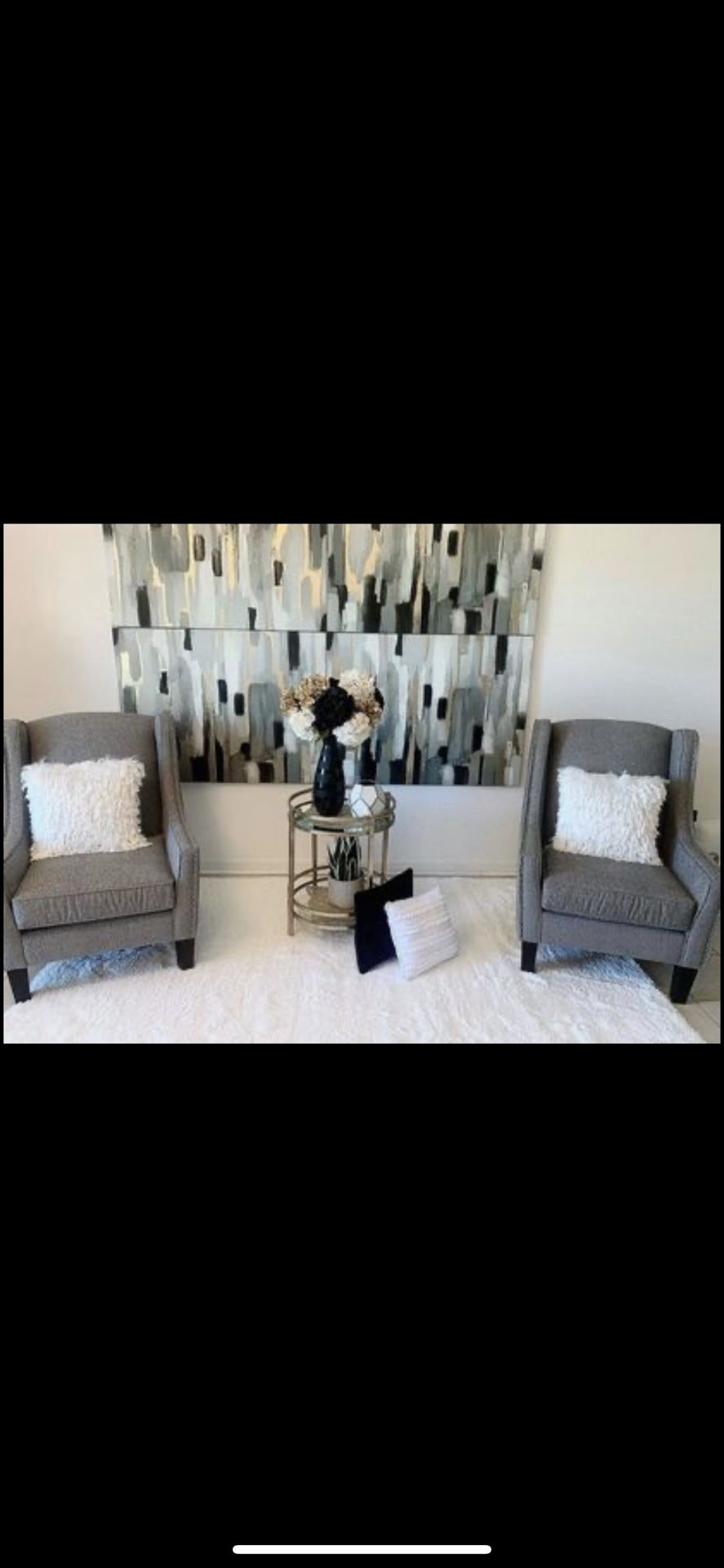 Wing back chairs new $500 each or $700 for both Crystal lighting $150 each or two for $200 Oval crystal lighting $200 Wall painting $80 Silver vase with flowers $40 Silver Mirror Vase $35