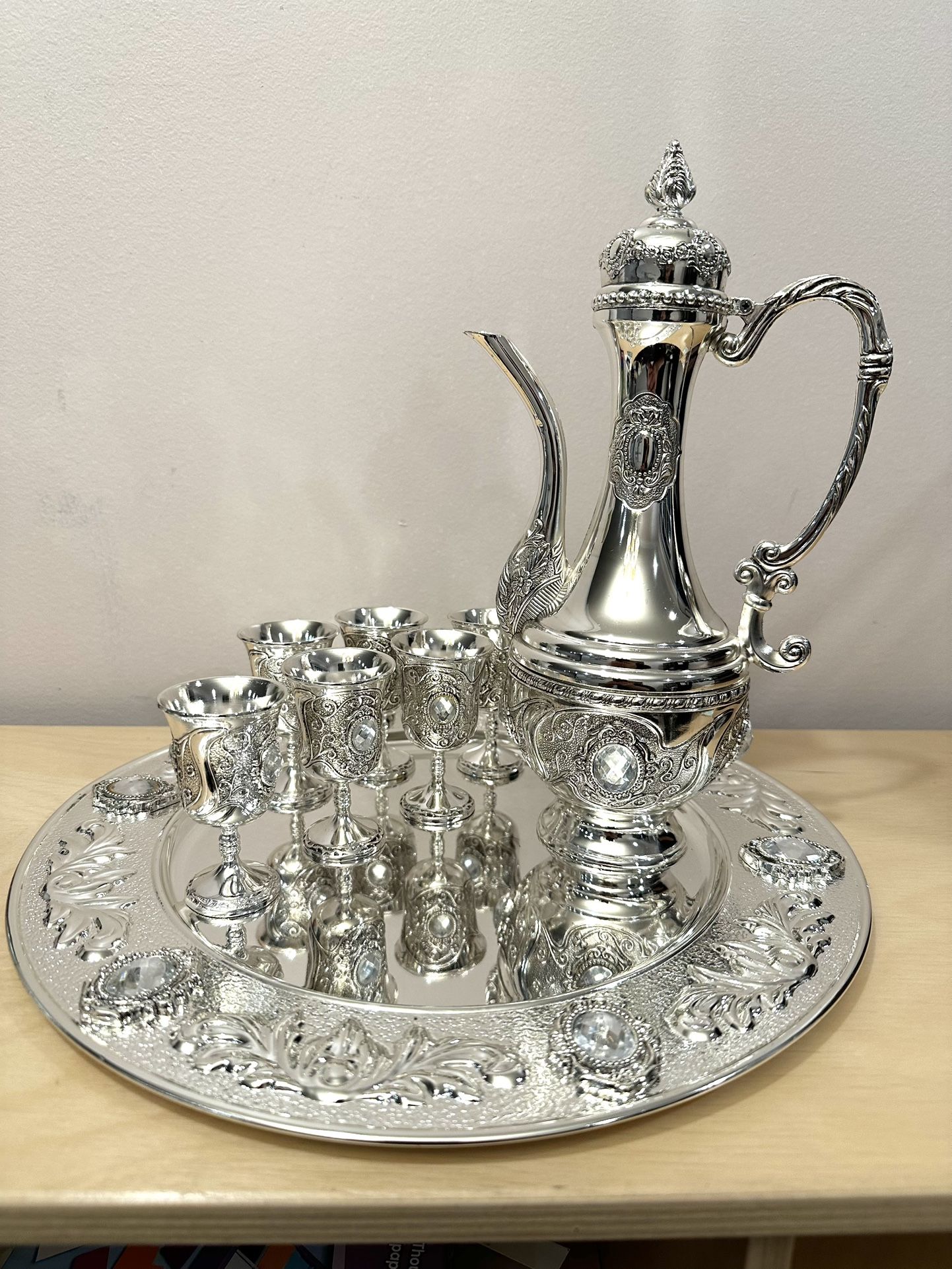 Brand new with box -Liquor serving set -carafe with 6 shot glasses and serving plate -Shiny Silver with Middle Eastern design -material is metal