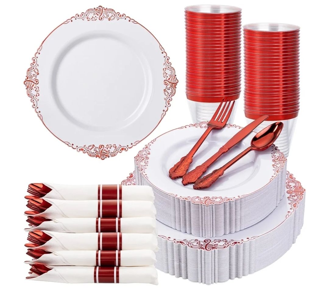 350PCS Red Plastic Plates - White Red Plastic Dinnerware Set for 50 Guests - 100 Red Disposable Plates, 50 Pre Rolled Cutlery Set, 50 Cups Perfect for
