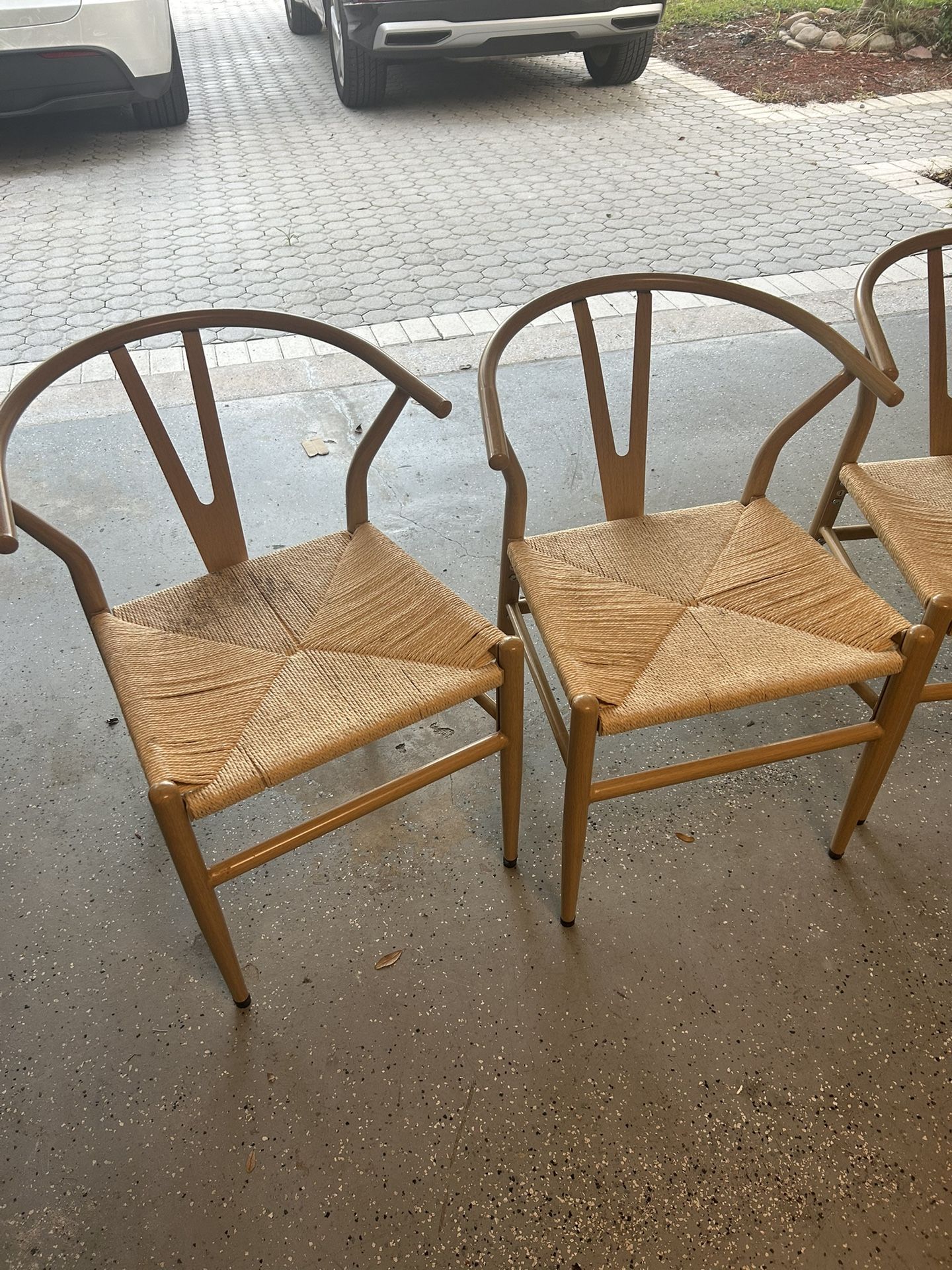 Selling a set of 4 Metal Weave Arm Chairs with Y-shaped backrests and hemp-style woven seats. - Metal frame, mid-century style - Selling all 4 together for $30 total - Used condition with visible dirt and wear – please see photos - One of the chairs needs to be glued as the metal frame moves around - Sturdy and functional, just need a good cleaning