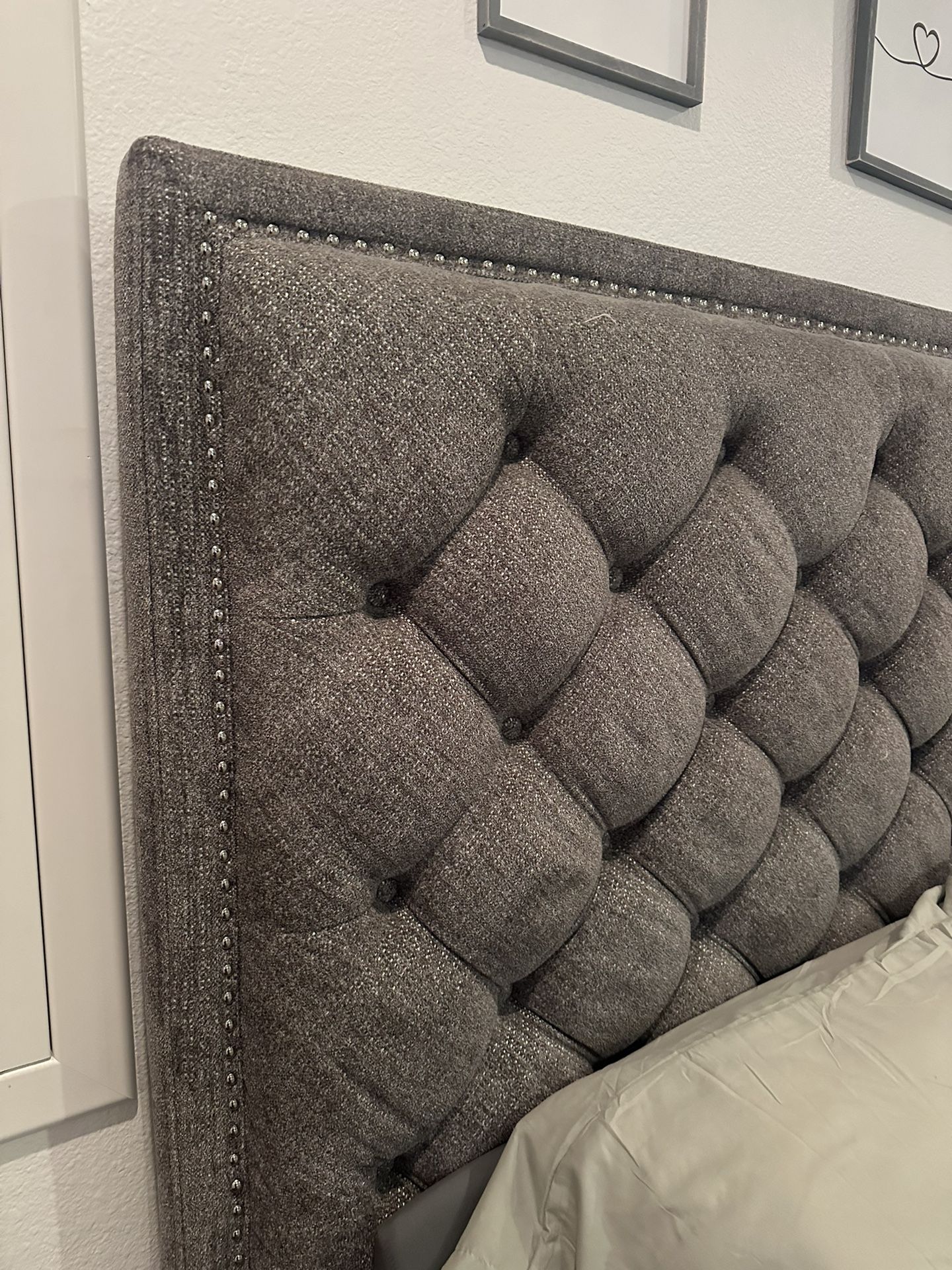 Dark gray upholstered bed frame. Nail head trim. Box springs included. King size. Must be picked up!!