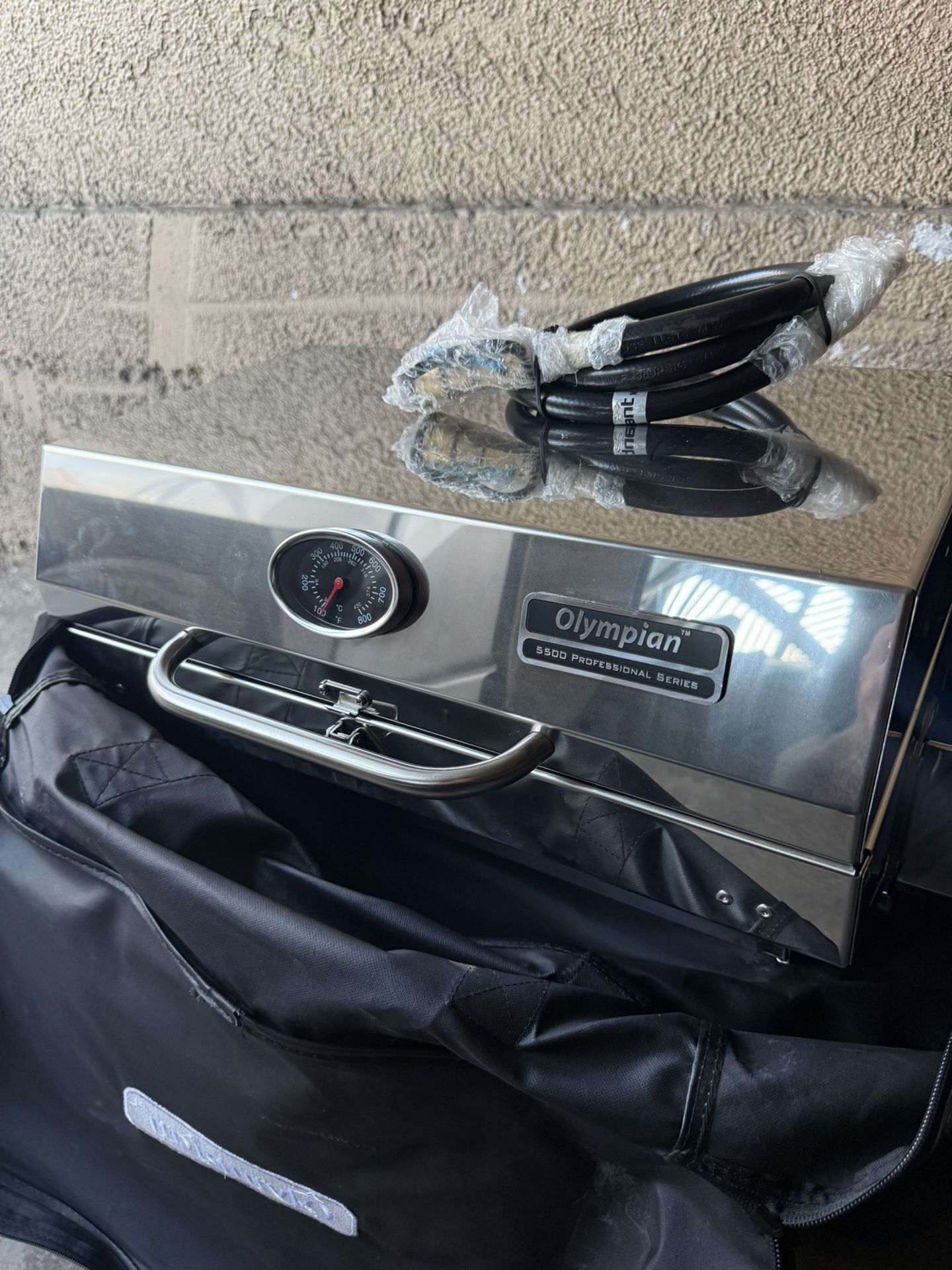 Brand new never used. My father bought it for his RV and never cooked. And then never use the RV then sold it. What a waste. Model No : (contact info removed) UPC : (contact info removed) Brand : Camco Country of Origin : United States Camco 57305 Olympian 5500 Stainless Steel Portable/RV Grill Connects to low pressure propane supply on RV Includes mounting bracket for hanging on RV mounting rail and folding legs for tabletop use Quick connect hose and quick connect valve