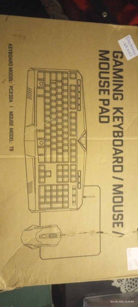 Brand New in box,never used. Gaming keyboard,mouse,and mouse pad. Keyboard model pc232a mouse model t9