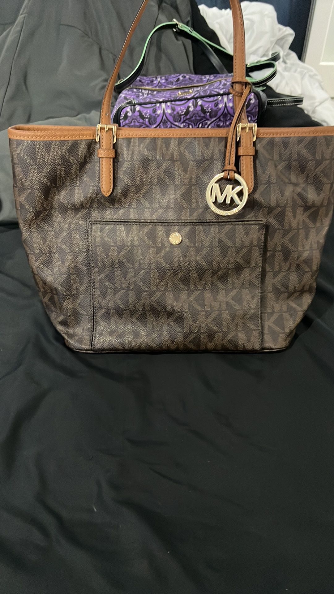 Normal wear. Main pocket may need a little cleaning. Only used a couple of times. No peeling or tears in the leather.
