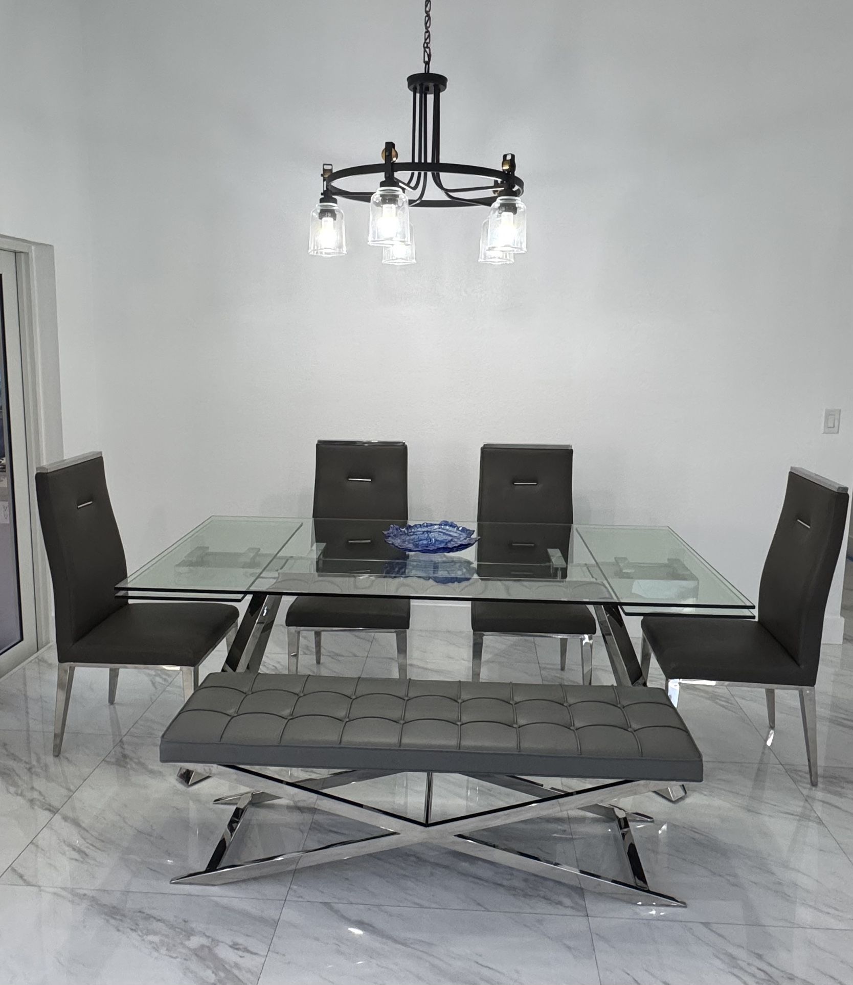 Dining table with four chairs and a bench, very spacious, it's brand new, seats six people, but it expands to accommodate 8-10 people.