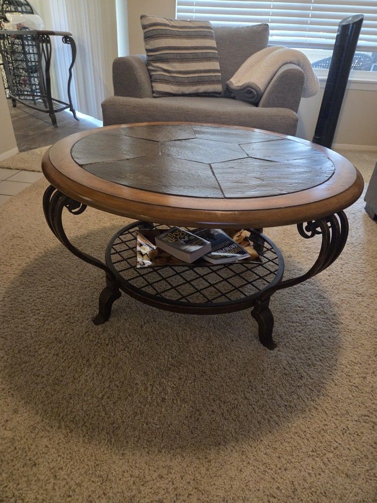 Matching set. They are solid slate inset. These are heavy and beautiful. There are some scratches that can be fixed with a furniture crayon. I used the sofa Table as a TV stand for a 55in flat-screen. You must haul. I can't deliver. Price is for both pieces.
