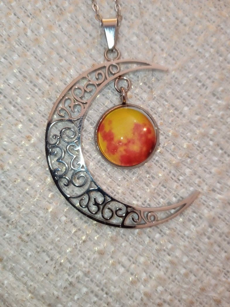 Jewelry.. Orange Resin Crescent Moon With Charm Pendant Necklaces In Stainless Steel.