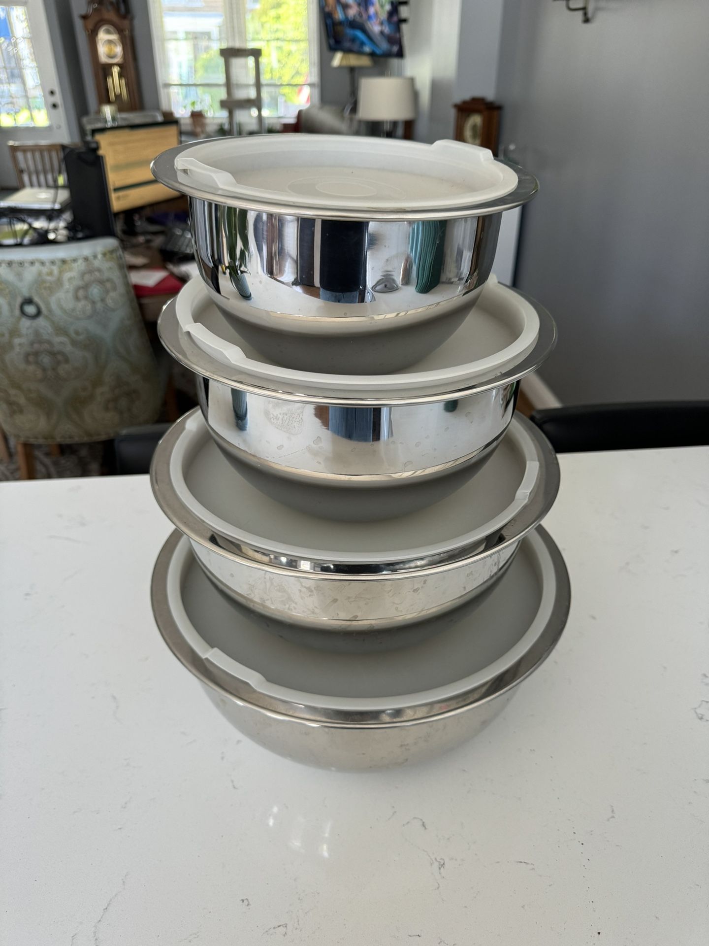 Wolf Gang Puck Stainless Steel set of four stacking mixing bowl with lids! New condition. Great for family events and large gatherings.