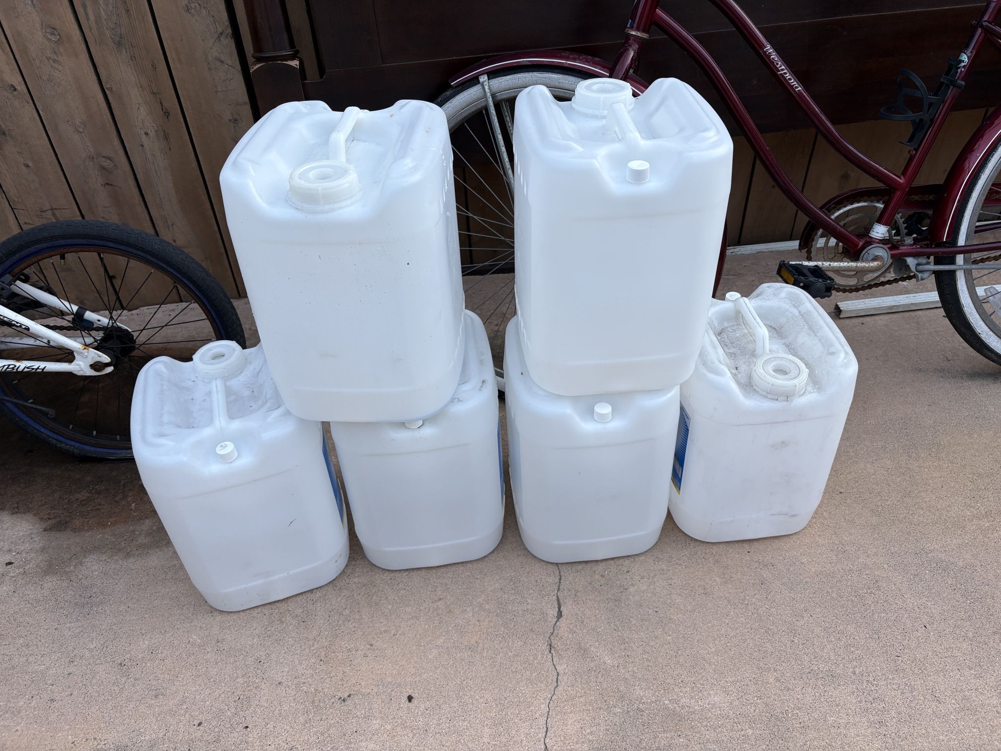 Five emergency 5 gallon rain water containers