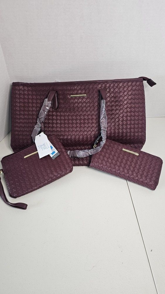 New Time and Tru 3pc tote/Purse set. Woven Red. Set includes Lg Tote, Wristlet-Pouch Crossbody, & Zip Around Wallet. Compliments many styles and fashions. Awesome gift idea.
