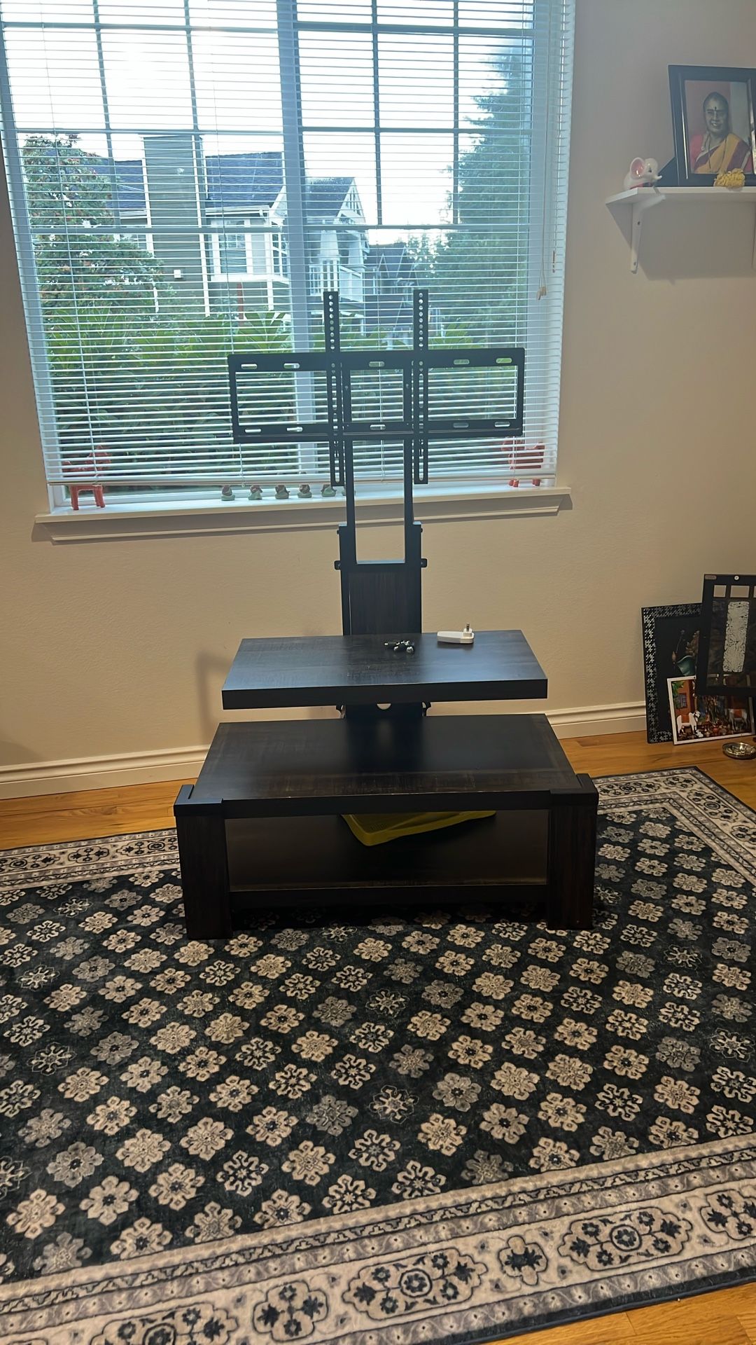 Lightly used TV stand. It can hold tvs from 40-55 inches firmly. We mounted our new tv and does not need this