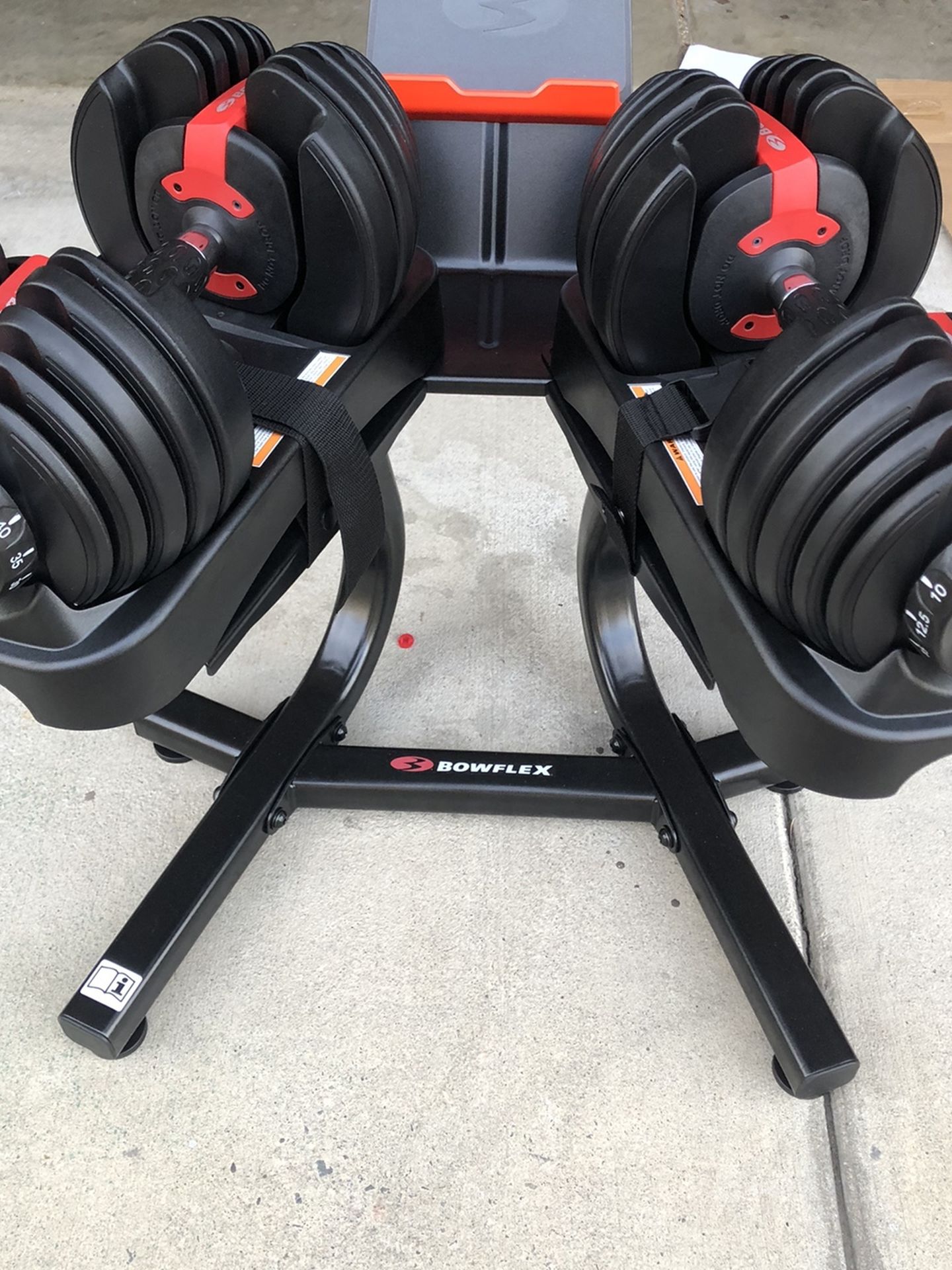 Immaculate condition BRAND NEW Bowflex adjustable dumbells with resting stand. Brand new 5lb -52lb adjustable incriments excellent condition.Comes with freestanding base for easy storage, fully assembled. Perfect for home gym applications and limited space needs. Will not last long.