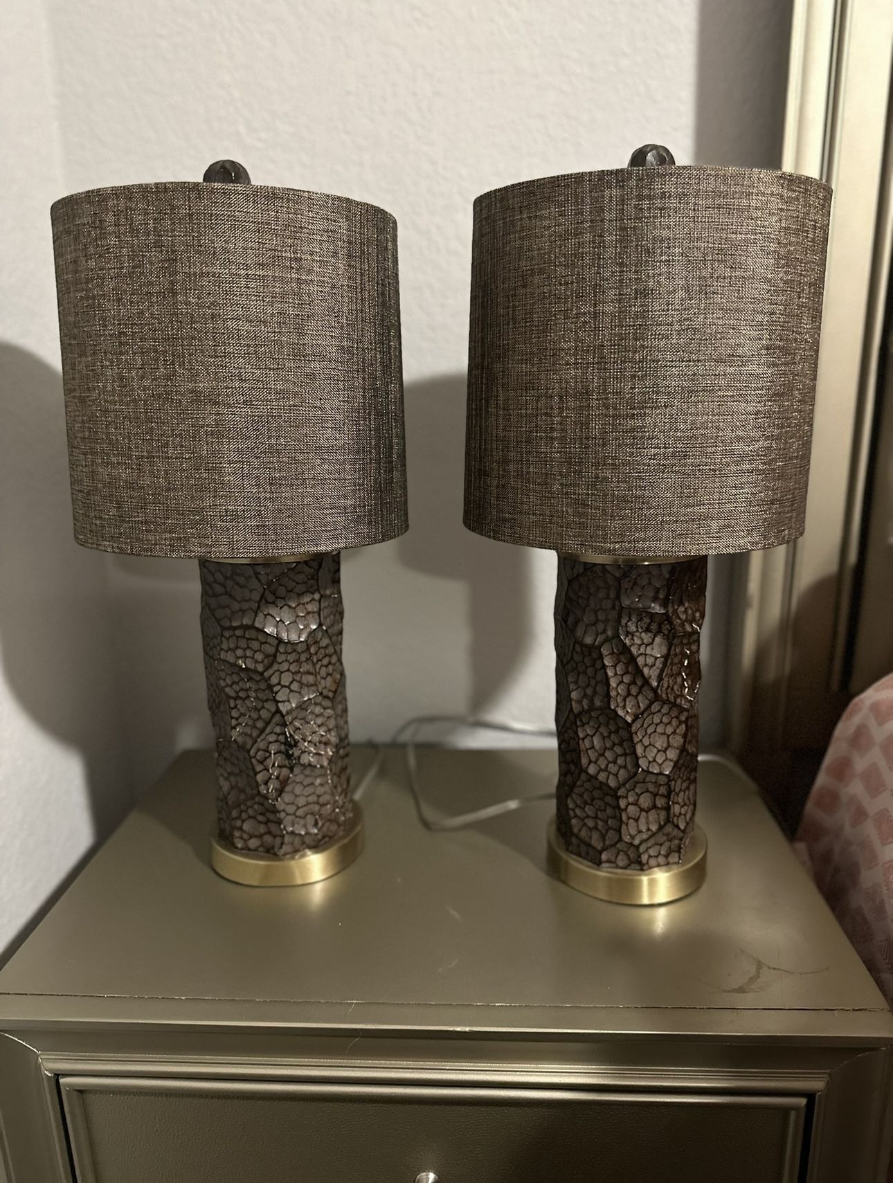 Beautiful matching lamp set with a unique textured base and gold accents. Shades and bases are in good condition and both lamps work perfectly. Pick up only