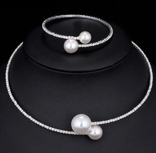 Brand NEW Shiny Rhinestone Faux Pearl Collar Necklace & Adjustable Bracelet Bride Set Accessories