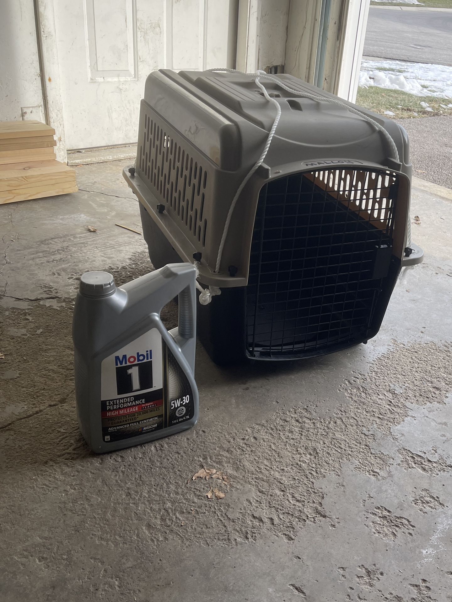 28” long, 20” wide, 20” tall, Broken handle, make shift handle with rope for carrying (works great), name on crate can be removed with nail polish remover Tag originally said “for dogs up to 50lbs”