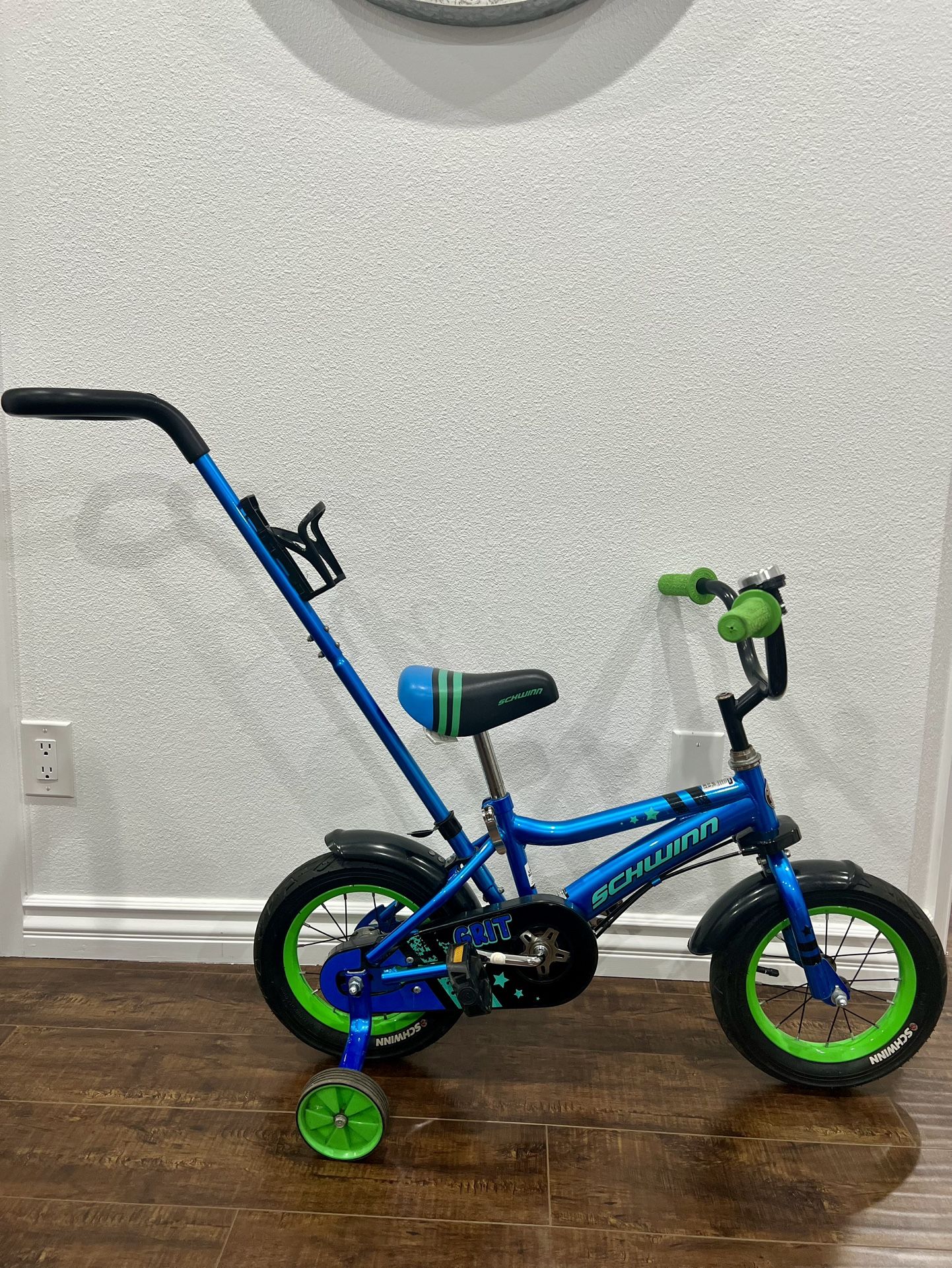 Schwinn Grit 12” kids bike in great condition. Perfect starter bike for toddlers learning to ride. • 12” wheels • Training wheels (included) • Removable parent push handle • Coaster brake (pedal backward to stop) • Front & rear fenders • Fully assembled and ready to ride Bike is clean, well maintained, and everything works properly. Parent push handle steering (left/right) needs adjustment. Tires hold air, brakes work, and no major damage — just normal light wear from use. Great for ages 2–4. Current retail price is $193.20 Flexible on meet-up location and time. Message me with any questions!