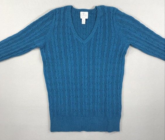 Women's Medium. Teal. Cable Knit Ribbed. No holes, rips, stains, or odors. Pre-Laundered, ready to wear. Please see pictures. Coming form a smoke free home. Measurements (approximate) inches with clothing flat and not stretched. Chest: 17" Waist: 14" Length: 23.5" Sleeve: 24.5" Fast Shipping with 1 Day or Less Handling Time. Thank you for viewing and feel free to message with any questions or offers.