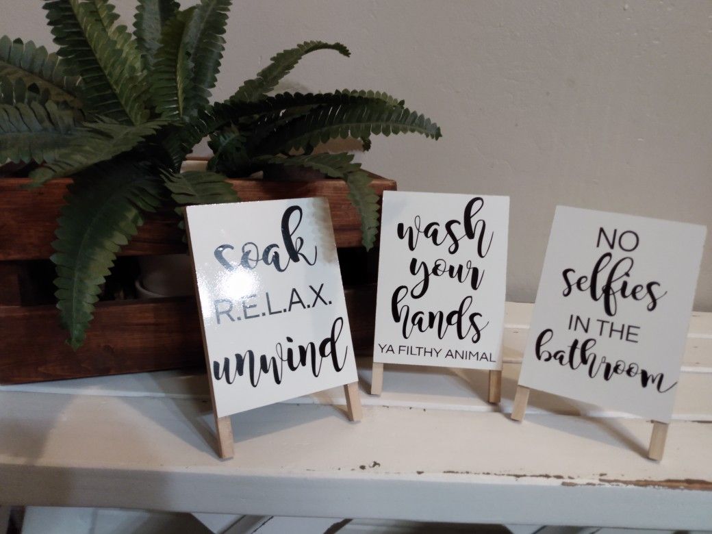 Farmhouse inspired bathroom signs. 7 inches tall x 4.5 inches wide. $6 each or $16 for the set of 3.